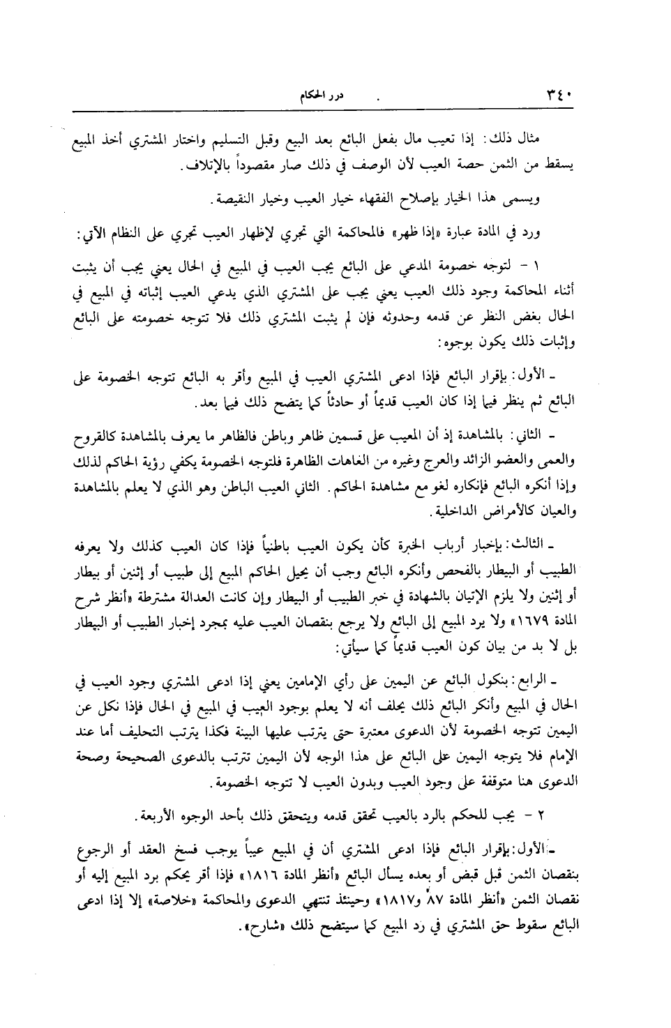 الْأَوَّلُ: بِإِقْرَارِ الْبَائِعِ فَإِذَا ادَّعَى الْمُشْتَرِي أَنَّ فِي الْمَبِيعِ عَيْبًا يُوجِبُ فَسْخَ الْعَقْدِ أَوْ الرُّجُوعَ بِنُقْصَانِ الثَّمَنِ قَبْلَ قَبْضِهِ أَوْ بَعْدَهُ يُسْأَلُ الْبَائِعُ " اُنْظُرْ الْمَادَّةَ 1816 " فَإِذَا أَقَرَّ يُحْكَمُ بِرَدِّ الْمَبِيعِ إلَيْهِ أَوْ نُقْصَانِ الثَّمَنِ " اُنْظُرْ الْمَادَّةَ 87 و 1817 " وَحِينَئِذٍ تَنْتَهِي الدَّعْوَى وَالْمُحَاكَمَةُ " خُلَاصَةٌ " إلَّا إذَا ادَّعَى الْبَائِعُ سُقُوطَ حَقِّ الْمُشْتَرِي فِي رَدِّ الْمَبِيعِ كَمَا سَيَتَّضِحُ ذَلِكَ " شَارِحٌ ".
