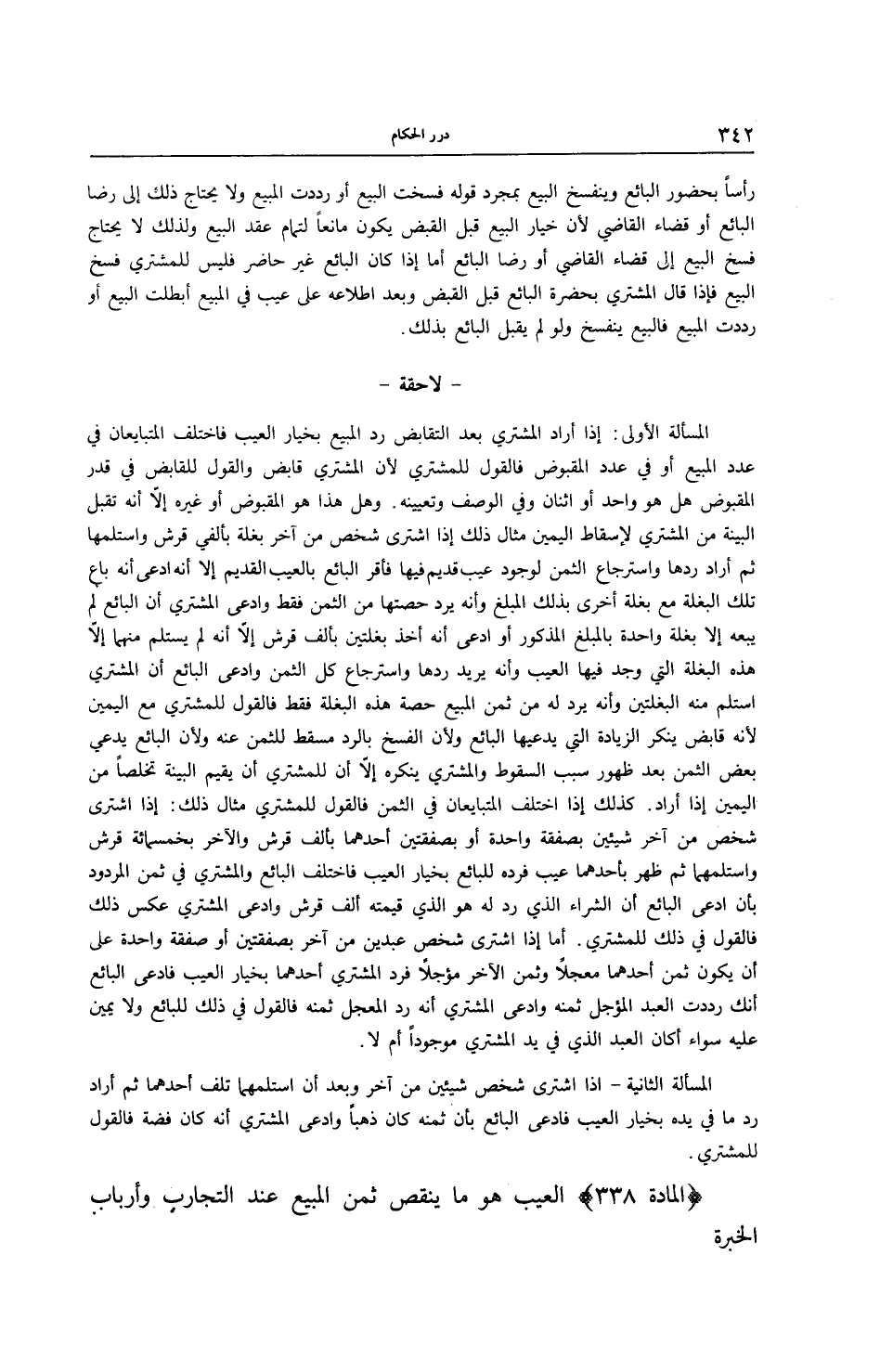 [ (الْمَادَّةُ 338) الْعَيْبُ هُوَ مَا يُنْقِصُ ثَمَنَ الْمَبِيعِ عِنْدَ التَّجَارِبِ وَأَرْبَابِ الْخِبْرَةِ]