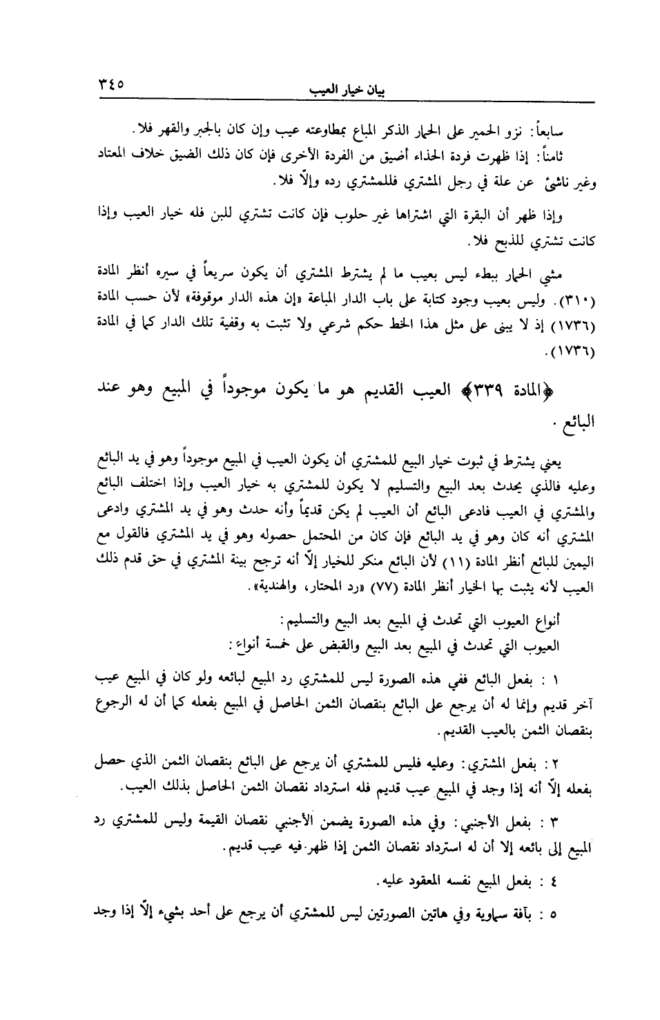 [ (الْمَادَّةُ 339) الْعَيْبُ الْقَدِيمُ هُوَ مَا يَكُونُ مَوْجُودًا فِي الْمَبِيعِ وَهُوَ عِنْدَ الْبَائِعِ]