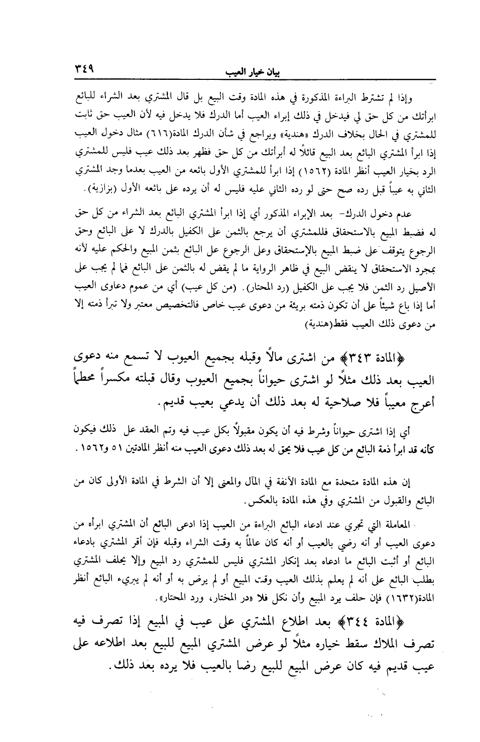 (الْمَادَّةُ 343) مَنْ اشْتَرَى مَالًا وَقَبِلَهُ بِجَمِيعِ الْعُيُوبِ لَا تُسْمَعُ مِنْهُ دَعْوَى الْعَيْبِ بَعْدَ ذَلِكَ، مَثَلًا لَوْ اشْتَرَى حَيَوَانًا بِجَمِيعِ الْعُيُوبِ وَقَالَ: قَبِلْتُهُ مُكَسَّرًا مُحَطَّمًا أَعْرَجَ مَعِيبًا؛ فَلَا صَلَاحِيَةَ لَهُ بَعْدَ ذَلِكَ أَنْ يَدَّعِيَ بِعَيْبٍ قَدِيمٍ أَيْ إذَا اشْتَرَى حَيَوَانًا وَشَرَطَ فِيهِ أَنْ يَكُونَ مَقْبُولًا بِكُلِّ عَيْبٍ فِيهِ وَتَمَّ الْعَقْدُ عَلَى ذَلِكَ فَيَكُونُ كَأَنَّهُ قَدْ أَبْرَأَ ذِمَّةَ الْبَائِعِ مِنْ كُلِّ عَيْبٍ؛ فَلَا يَحِقُّ لَهُ بَعْدَ ذَلِكَ دَعْوَى الْعَيْبِ مِنْهُ اُنْظُرْ الْمَادَّتَيْنِ 51 و 1562.