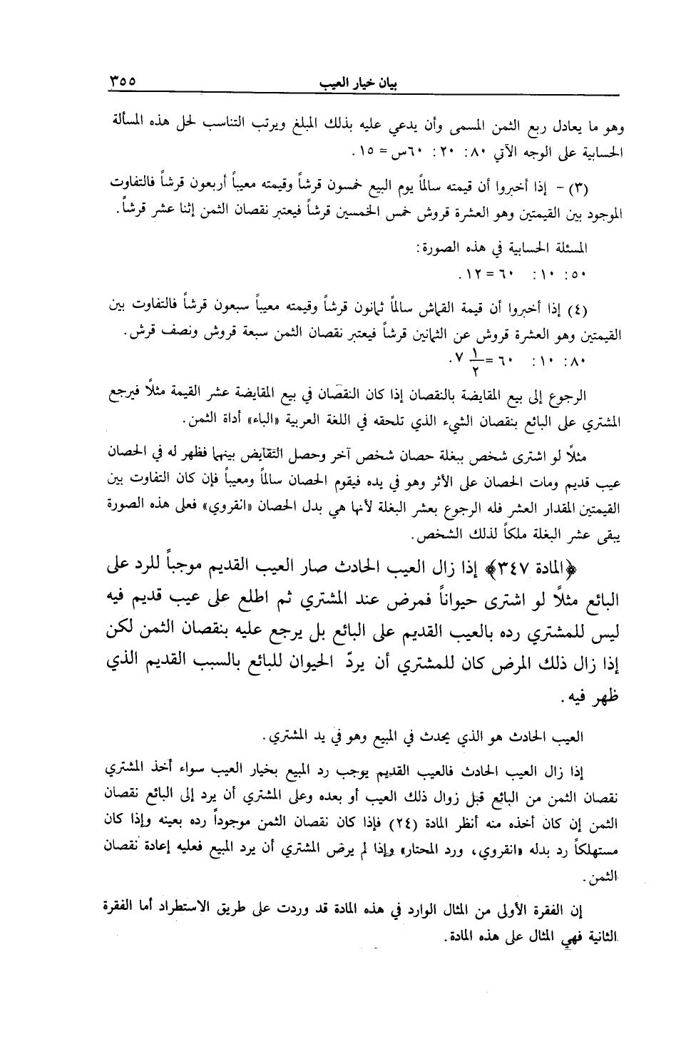 (3) - إذَا أَخْبَرُوا أَنَّ قِيمَتَهُ سَالِمًا يَوْمَ الْبَيْعِ خَمْسُونَ قِرْشًا وَقِيمَتَهُ مَعِيبًا أَرْبَعُونَ قُرَشًا فَالتَّفَاوُتُ الْمَوْجُودُ بَيْنَ الْقِيمَتَيْنِ وَهُوَ الْعَشَرَةُ قُرُوشٍ خُمْسُ الْخَمْسِينَ قِرْشًا فَيُعْتَبَرُ نُقْصَانُ الثَّمَنِ اثْنَا عَشَرَ قِرْشًا.
