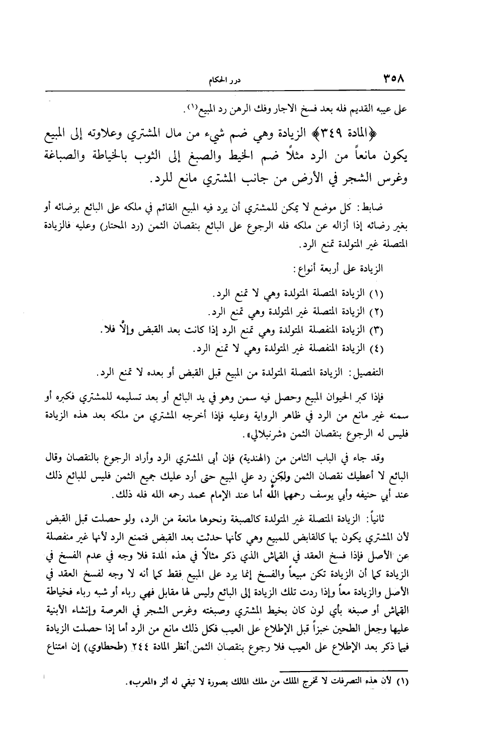 (الْمَادَّةُ 349) الزِّيَادَةُ وَهِيَ ضَمُّ شَيْءٍ مِنْ مَالِ الْمُشْتَرِي وَعِلَاوَتُهُ إلَى الْمَبِيعِ يَكُونُ مَانِعًا مِنْ الرَّدِّ، مَثَلًا: ضَمُّ الْخَيْطِ وَالصَّبْغِ إلَى الثَّوْبِ بِالْخِيَاطَةِ وَالصِّبَاغَةِ وَغَرْسِ الشَّجَرِ فِي الْأَرْضِ مِنْ جَانِبِ الْمُشْتَرِي مَانِعٌ لِلرَّدِّ.