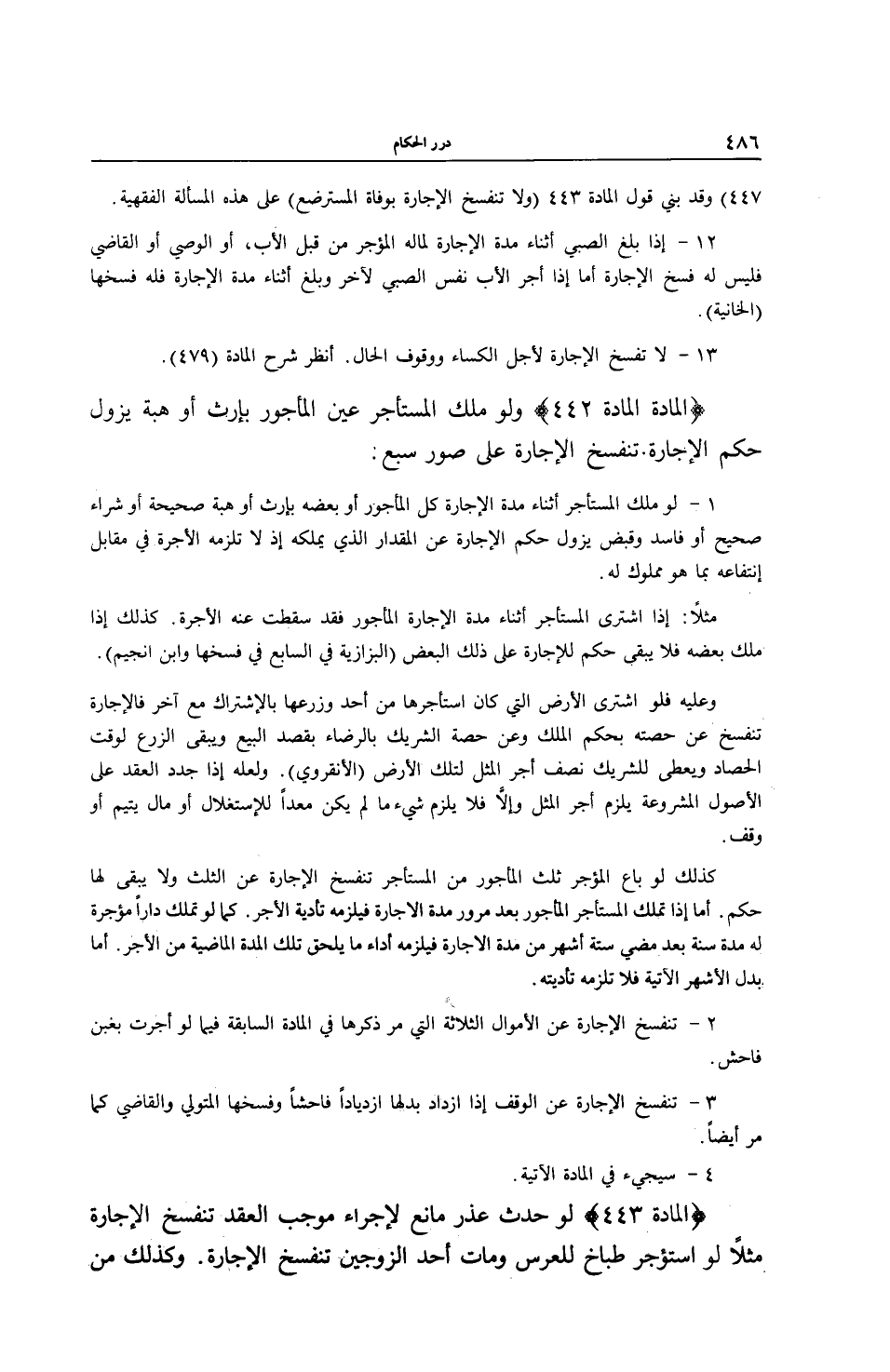 [ (الْمَادَّةُ 443) لَوْ حَدَثَ عُذْرٌ مَانِعٌ لِإِجْرَاءِ مُوجَبِ الْعَقْدِ تَنْفَسِخُ الْإِجَارَةُ]