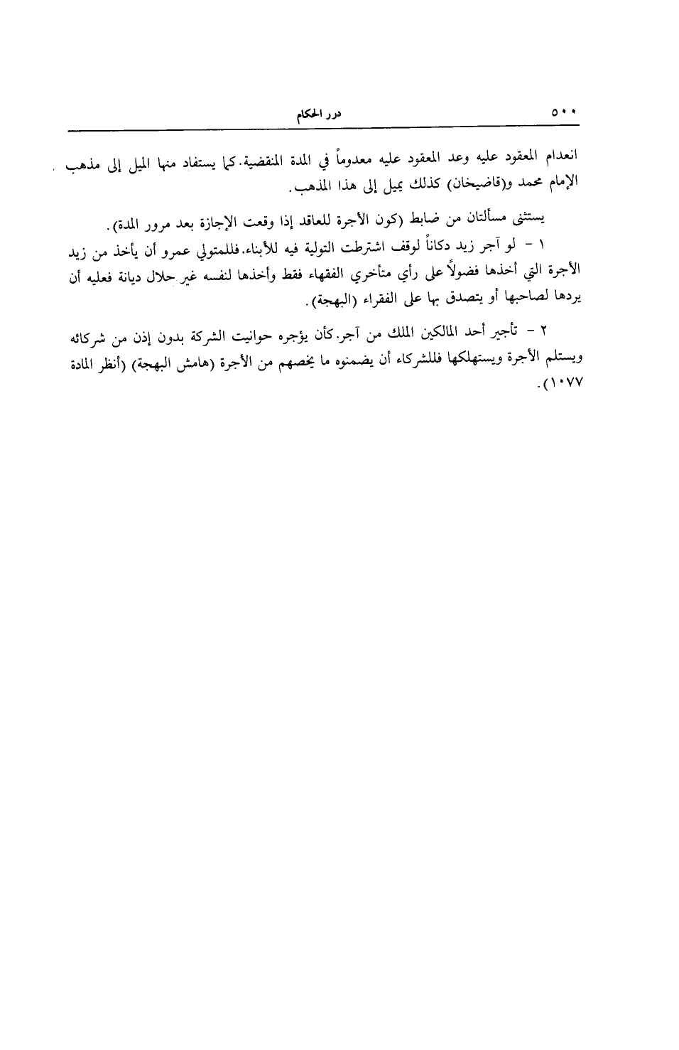 2 - تَأْجِيرُ أَحَدِ الْمَالِكَيْنِ الْمِلْكَ مِنْ آخَرَ كَأَنْ يُؤَجِّرَهُ حَوَانِيتَ الشَّرِكَةِ بِدُونِ إذْنٍ مِنْ شُرَكَائِهِ وَيَسْتَلِمَ الْأُجْرَةَ وَيَسْتَهْلِكَهَا فَلِلشُّرَكَاءِ أَنْ يُضَمِّنُوهُ مَا يَخُصُّهُمْ مِنْ الْأُجْرَةِ (هَامِشُ الْبَهْجَةِ) (اُنْظُرْ الْمَادَّةَ 77 1) .
