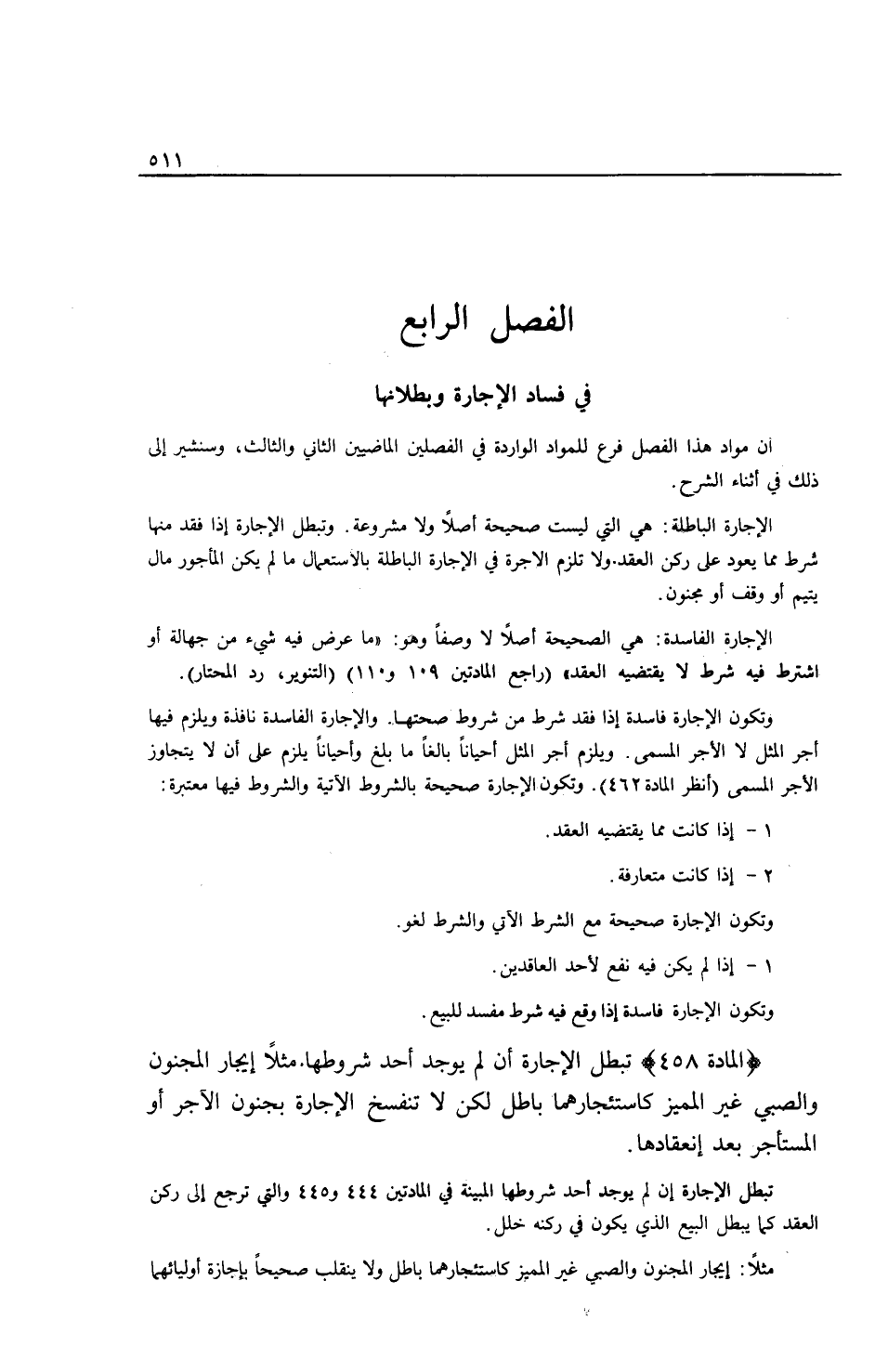تَبْطُلُ الْإِجَارَةُ إنْ لَمْ يُوجَدْ أَحَدُ شُرُوطِهَا الْمُبَيَّنَةِ فِي الْمَادَّتَيْنِ 444 و 445 وَاَلَّتِي تَرْجِعُ إلَى رُكْنِ الْعَقْدِ كَمَا يَبْطُلُ الْبَيْعُ الَّذِي يَكُونُ فِي رُكْنِهِ خَلَلٌ، مَثَلًا: إيجَارُ الْمَجْنُونِ وَالصَّبِيِّ غَيْرِ الْمُمَيِّزِ كَاسْتِئْجَارِهِمَا بَاطِلٌ وَلَا يَنْقَلِبُ صَحِيحًا بِإِجَازَةِ أَوْلِيَائِهِمَا