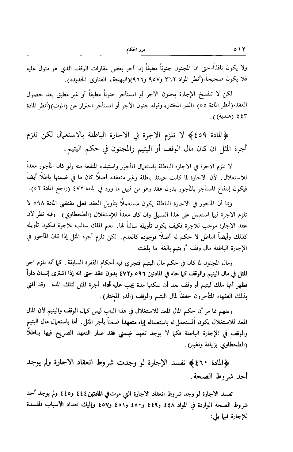 (الْمَادَّةُ 459) لَا تَلْزَمُ الْأُجْرَةُ فِي الْإِجَارَةِ الْبَاطِلَةِ بِالِاسْتِعْمَالِ لَكِنْ تَلْزَمُ أُجْرَةُ الْمِثْلِ إنْ كَانَ مَالُ الْوَقْفِ أَوْ الْيَتِيمِ. وَالْمَجْنُونُ - فِي حُكْمِ الْيَتِيمِ.