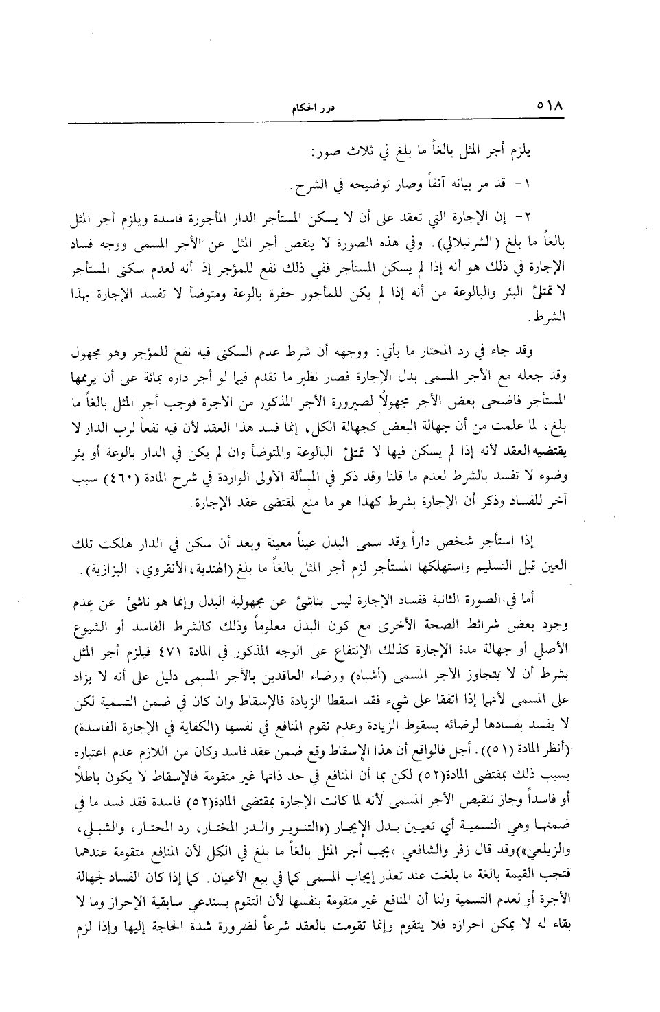 أَمَّا فِي الصُّورَةِ الثَّانِيَةِ فَفَسَادُ الْإِجَارَةِ لَيْسَ بِنَاشِئٍ عَنْ مَجْهُولِيَّةِ الْبَدَلِ وَإِنَّمَا هُوَ نَاشِئٌ عَنْ عَدَمِ وُجُودِ بَعْضِ شَرَائِطِ الصِّحَّةِ الْأُخْرَى مَعَ كَوْنِ الْبَدَلِ مَعْلُومًا وَذَلِكَ كَالشَّرْطِ الْفَاسِدِ أَوْ الشُّيُوعِ الْأَصْلِيِّ أَوْ جَهَالَةِ مُدَّةِ الْإِجَارَةِ كَذَلِكَ الِانْتِفَاعُ عَلَى الْوَجْهِ الْمَذْكُورِ فِي الْمَادَّةِ 471 فَيَلْزَمُ أَجْرُ الْمِثْلِ بِشَرْطِ أَنْ لَا يَتَجَاوَزَ الْأَجْرَ الْمُسَمَّى (أَشْبَاهٌ) وَرِضَاءُ الْعَاقِدَيْنِ بِالْأَجْرِ الْمُسَمَّى دَلِيلٌ عَلَى أَنَّهُ لَا يُزَادُ عَلَى الْمُسَمَّى لِأَنَّهُمَا إذَا اتَّفَقَا عَلَى شَيْءٍ فَقَدْ أَسْقَطَا الزِّيَادَةَ فَالْإِسْقَاطُ وَإِنْ كَانَ فِي ضِمْنِ التَّسْمِيَةِ لَكِنْ لَا يَفْسُدُ بِفَسَادِهَا لِرِضَائِهِ بِسُقُوطِ الزِّيَادَةِ وَعَدَمِ تَقَوُّمِ الْمَنَافِعِ فِي نَفْسِهَا (الْكِفَايَةُ فِي الْإِجَارَةِ الْفَاسِدَةِ) (اُنْظُرْ الْمَادَّةَ (51)) .