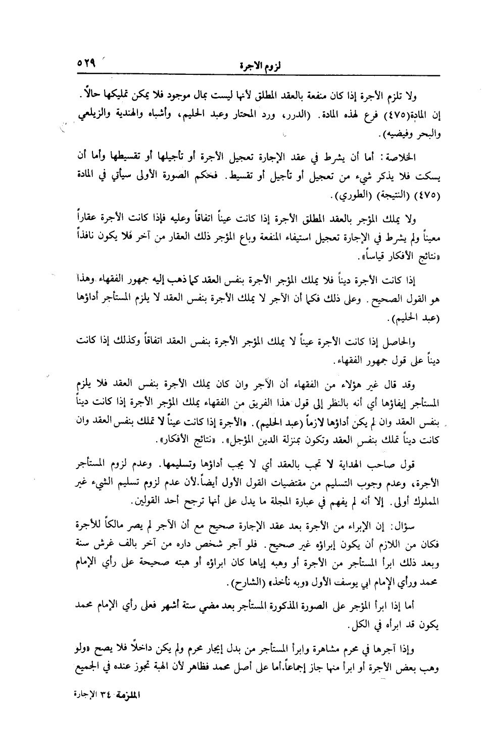 وَالْحَاصِلُ إذَا كَانَتْ الْأُجْرَةُ عَيْنًا لَا يَمْلِكُ الْمُؤَجِّرُ الْأُجْرَةَ بِنَفْسِ الْعَقْدِ اتِّفَاقًا وَكَذَلِكَ إذَا كَانَتْ دَيْنًا عَلَى قَوْلِ جُمْهُورِ الْفُقَهَاءِ وَقَدْ قَالَ غَيْرُ هَؤُلَاءِ مِنْ الْفُقَهَاءِ إنَّ الْآجِرَ وَإِنْ كَانَ يَمْلِكُ الْأُجْرَةَ بِنَفْسِ الْعَقْدِ فَلَا يَلْزَمُ الْمُسْتَأْجِرَ إيفَاؤُهَا أَيْ أَنَّهُ بِالنَّظَرِ إلَى قَوْلِ هَذَا الْفَرِيقِ مِنْ الْفُقَهَاءِ يَمْلِكُ الْمُؤَجِّرُ الْأُجْرَةَ إذَا كَانَتْ دَيْنًا بِنَفْسِ الْعَقْدِ وَإِنْ لَمْ يَكُنْ أَدَاؤُهَا لَازِمًا (عَبْدُ الْحَلِيمِ) .