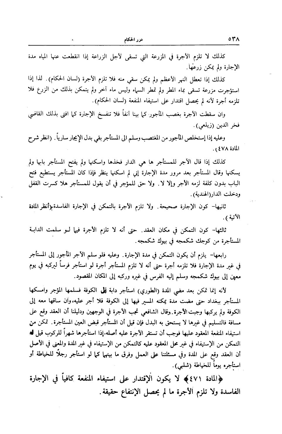 (الْمَادَّةُ 471) لَا يَكُونُ الِاقْتِدَارُ عَلَى اسْتِيفَاءِ الْمَنْفَعَةِ كَافِيًا فِي الْإِجَارَةِ الْفَاسِدَةِ وَلَا تَلْزَمُ الْأُجْرَةُ مَا لَمْ يَحْصُلْ الِانْتِفَاعُ حَقِيقَةً.