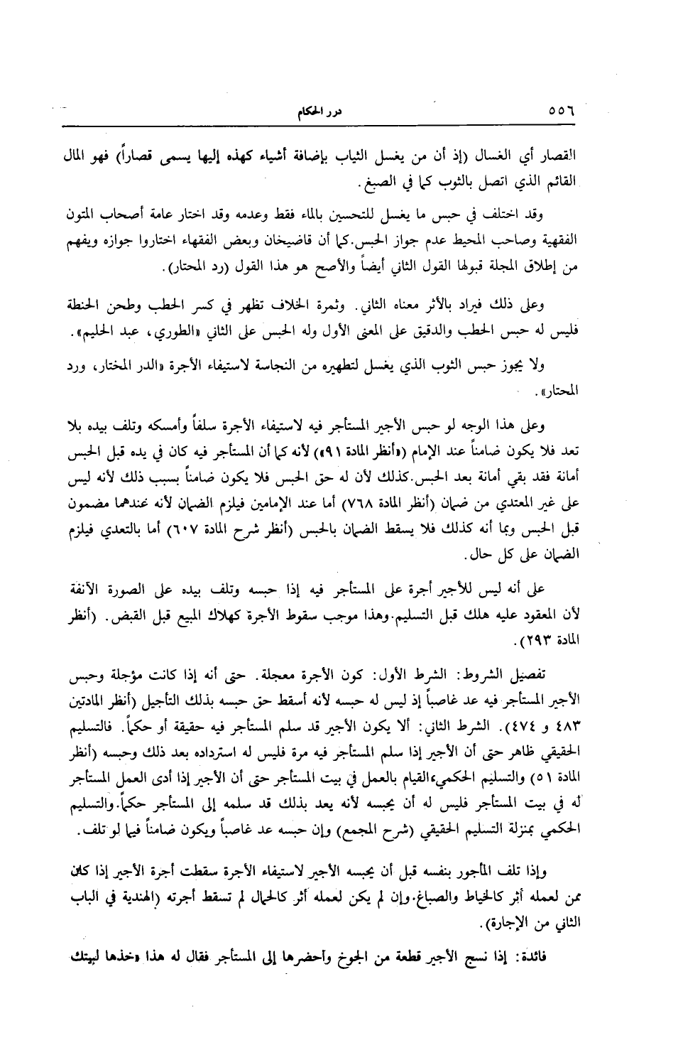 عَلَى أَنَّهُ لَيْسَ لِلْأَجِيرِ أُجْرَةٌ عَلَى الْمُسْتَأْجِرِ فِيهِ إذَا حَبَسَهُ وَتَلِفَ بِيَدِهِ عَلَى الصُّورَةِ الْآنِفَةِ لِأَنَّ الْمَعْقُودَ عَلَيْهِ هَلَكَ قَبْلَ التَّسْلِيمِ. وَهَذَا مُوجِبٌ سُقُوطَ الْأُجْرَةِ كَهَلَاكِ الْمَبِيعِ قَبْلَ الْقَبْضِ. (اُنْظُرْ الْمَادَّةَ 293) .