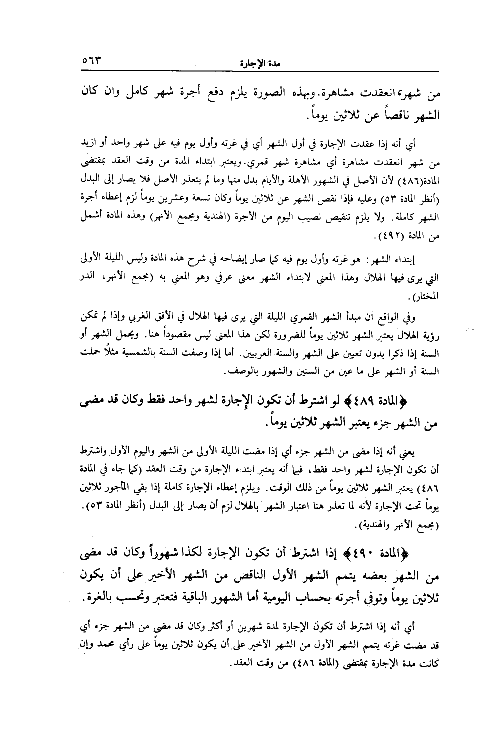 (الْمَادَّةُ 490) إذَا اشْتَرَطَ أَنْ تَكُونَ الْإِجَارَةُ لِكَذَا شُهُورٍ وَكَانَ قَدْ مَضَى مِنْ الشَّهْرِ بَعْضُهُ يُتَمَّمُ الشَّهْرُ الْأَوَّلُ النَّاقِصُ مِنْ الشَّهْرِ الْأَخِيرِ عَلَى أَنْ يَكُونَ ثَلَاثِينَ يَوْمًا وَتُوفَى أُجْرَتُهُ بِحِسَابِ الْيَوْمِيَّةِ، أَمَّا الشُّهُورُ الْبَاقِيَةُ فَتُعْتَبَرُ وَتُحْسَبُ بِالْغُرَّةِ. أَيْ أَنَّهُ إذَا اشْتَرَطَ أَنْ تَكُونَ الْإِجَارَةُ لِمُدَّةِ شَهْرَيْنِ أَوْ أَكْثَرَ وَكَانَ قَدْ مَضَى مِنْ الشَّهْرِ جُزْءٌ أَيْ قَدْ مَضَتْ غُرَّتُهُ يُتَمَّمُ الشَّهْرُ الْأَوَّلُ مِنْ الشَّهْرِ الْأَخِيرِ عَلَى أَنْ يَكُونَ ثَلَاثِينَ يَوْمًا عَلَى رَأْيِ مُحَمَّدٍ وَإِنْ كَانَتْ مُدَّةُ الْإِجَارَةِ بِمُقْتَضَى (الْمَادَّةِ 486) مِنْ وَقْتِ الْعَقْدِ.