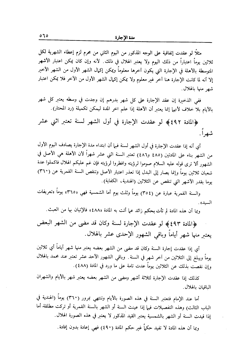 (الْمَادَّةُ 492) لَوْ عُقِدَتْ الْإِجَارَةُ فِي أَوَّلِ الشَّهْرِ لِسَنَةٍ تُعْتَبَرُ اثْنَيْ عَشَرَ شَهْرًا. أَيْ أَنَّهُ إذَا عُقِدَتْ الْإِجَارَةُ فِي أَوَّلِ الشَّهْرِ لِسَنَةٍ فَبِمَا أَنَّ ابْتِدَاءَ مُدَّةِ الْإِجَارَةِ يُصَادِفُ الْيَوْمَ الْأَوَّلَ مِنْ الشَّهْرِ بِنَاءً عَلَى الْمَادَّتَيْنِ (485 و 486) تُعْتَبَرُ السَّنَةُ اثْنَيْ عَشَرَ شَهْرًا لِأَنَّ الْأَهِلَّةَ هِيَ الْأَصْلُ فِي الشُّهُورِ أَلَا تَرَى قَوْلَهُ - عَلَيْهِ السَّلَامُ - «صُومُوا لِرُؤْيَتِهِ وَأَفْطِرُوا لِرُؤْيَتِهِ فَإِنْ غُمَّ عَلَيْكُمْ الْهِلَالُ فَأَكْمِلُوا عِدَّةَ شَعْبَانَ ثَلَاثِينَ يَوْمًا» وَإِنَّمَا يُصَارُ إلَى الْبَدَلِ إذَا تَعَذَّرَ اعْتِبَارُ الْأَصْلِ وَتَنْقُصُ السَّنَةُ الْقَمَرِيَّةُ عَنْ (360) يَوْمًا بِقَدْرِ الْأَشْهُرِ الَّتِي تَنْقُصُ عَنْ الثَّلَاثِينَ (الْهِنْدِيَّةُ، الْكِفَايَةُ) .