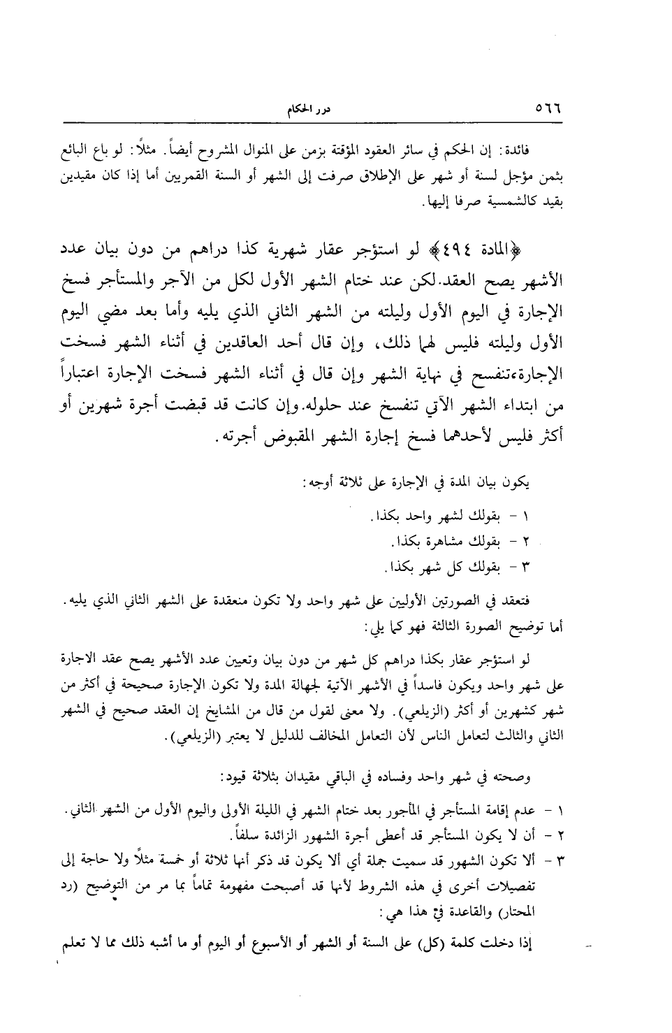 (الْمَادَّةُ 494) لَوْ اُسْتُؤْجِرَ عَقَارٌ شَهْرِيَّةً كَذَا دَرَاهِمَ مِنْ دُونِ بَيَانِ عَدَدِ الْأَشْهُرِ يَصِحُّ الْعَقْدُ. لَكِنْ عِنْدَ خِتَامِ الشَّهْرِ الْأَوَّلِ لِكُلٍّ مِنْ الْآجِرِ وَالْمُسْتَأْجِرِ فَسْخُ الْإِجَارَةِ فِي الْيَوْمِ الْأَوَّلِ وَلَيْلَتِهِ مِنْ الشَّهْرِ الثَّانِي الَّذِي يَلِيهِ وَأَمَّا بَعْدَ مُضِيِّ الْيَوْمِ الْأَوَّلِ وَلَيْلَتِهِ فَلَيْسَ لَهُمَا ذَلِكَ، وَإِنْ قَالَ أَحَدُ الْعَاقِدَيْنِ فِي أَثْنَاءِ الشَّهْرِ فَسَخْتُ الْإِجَارَةَ، تَنْفَسِخُ فِي نِهَايَةِ الشَّهْرِ وَإِنْ قَالَ فِي أَثْنَاءِ الشَّهْرِ فَسَخْت الْإِجَارَةَ اعْتِبَارًا مِنْ ابْتِدَاءِ الشَّهْرِ الْآتِي تَنْفَسِخُ عِنْدَ حُلُولِهِ.