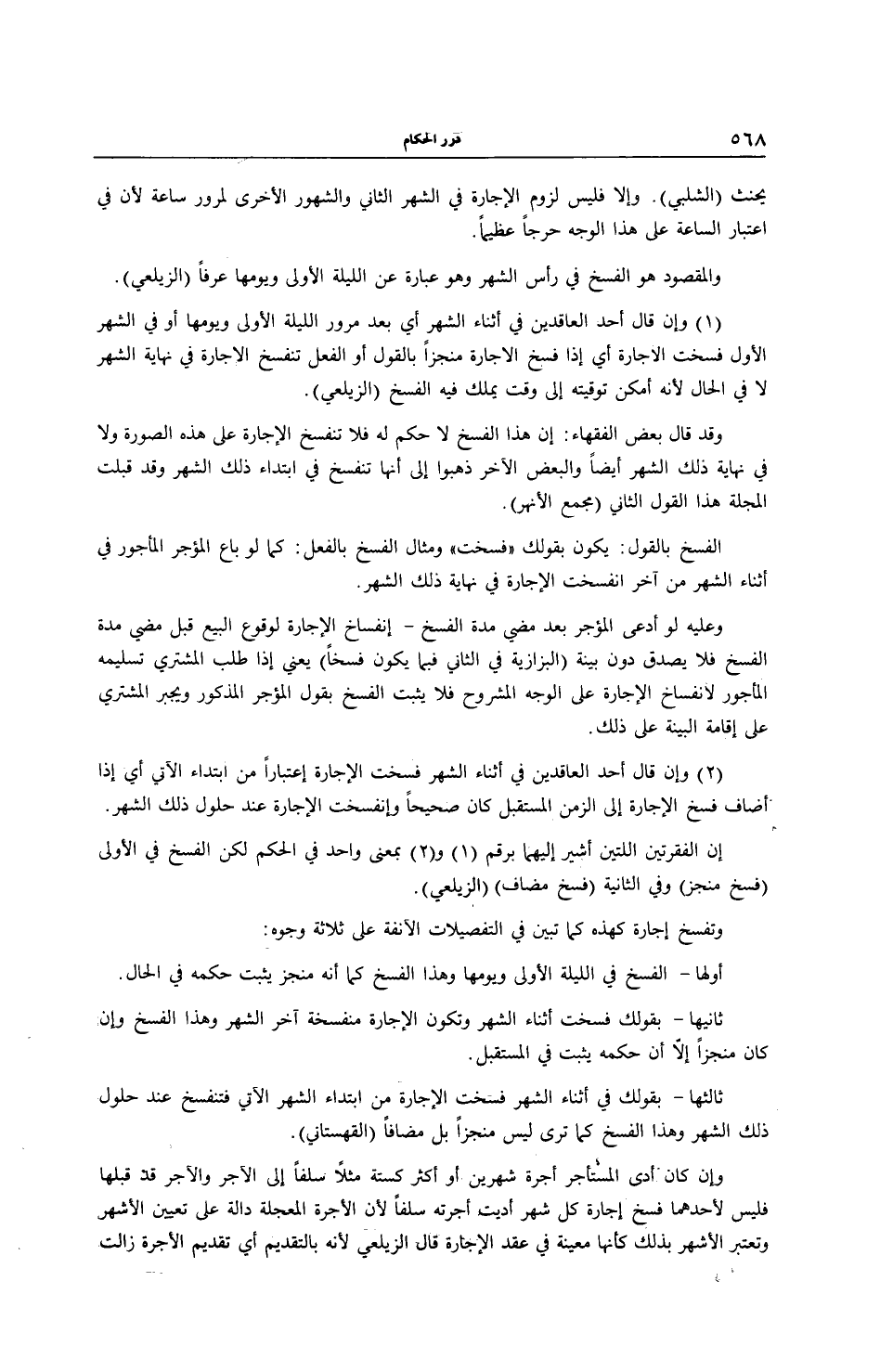 (1) وَإِنْ قَالَ أَحَدُ الْعَاقِدَيْنِ فِي أَثْنَاءِ الشَّهْرِ أَيْ بَعْدَ مُرُورِ اللَّيْلَةِ الْأُولَى وَيَوْمِهَا أَوْ فِي الشَّهْرِ الْأَوَّلِ فَسَخْت الْإِجَارَةُ أَيْ إذَا فَسَخَ الْإِجَارَةَ مُنَجِّزًا بِالْقَوْلِ أَوْ الْفِعْلِ تَنْفَسِخُ الْإِجَارَةُ فِي نِهَايَةِ الشَّهْرِ لَا فِي الْحَالِ لِأَنَّهُ أَمْكَنَ تَوْقِيتُهُ إلَى وَقْتٍ يَمْلِكُ فِيهِ الْفَسْخَ (الزَّيْلَعِيّ) وَقَدْ قَالَ بَعْضُ الْفُقَهَاءِ إنَّ هَذَا الْفَسْخَ لَا حُكْمَ لَهُ فَلَا تَنْفَسِخُ الْإِجَارَةُ عَلَى هَذِهِ الصُّورَةِ وَلَا فِي نِهَايَةِ ذَلِكَ الشَّهْرِ أَيْضًا. وَالْبَعْضُ الْآخَرُ ذَهَبُوا إلَى أَنَّهَا تَنْفَسِخُ فِي ابْتِدَاءِ ذَلِكَ الشَّهْرِ وَقَدْ قَبِلَتْ الْمَجَلَّةُ هَذَا الْقَوْلَ الثَّانِي (مَجْمَعُ الْأَنْهُرِ) .