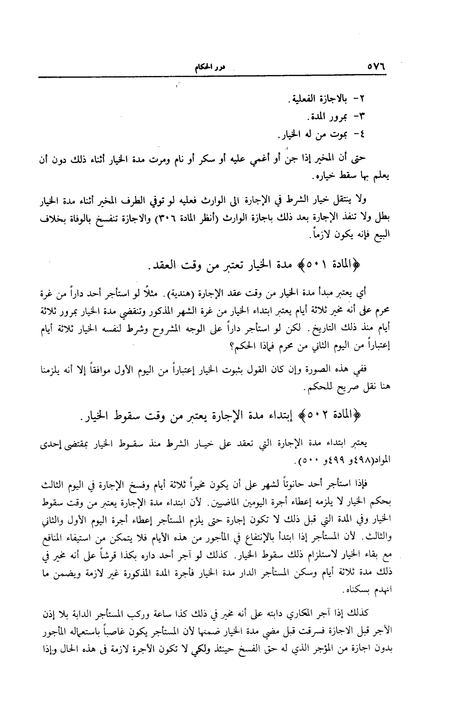 يُعْتَبَرُ ابْتِدَاءُ مُدَّةِ الْإِجَارَةِ الَّتِي تُعْقَدُ عَلَى خِيَارِ الشَّرْطِ مُنْذُ سُقُوطِ الْخِيَارِ بِمُقْتَضَى إحْدَى الْمَوَادِّ (498 وَ 499 وَ 500) .