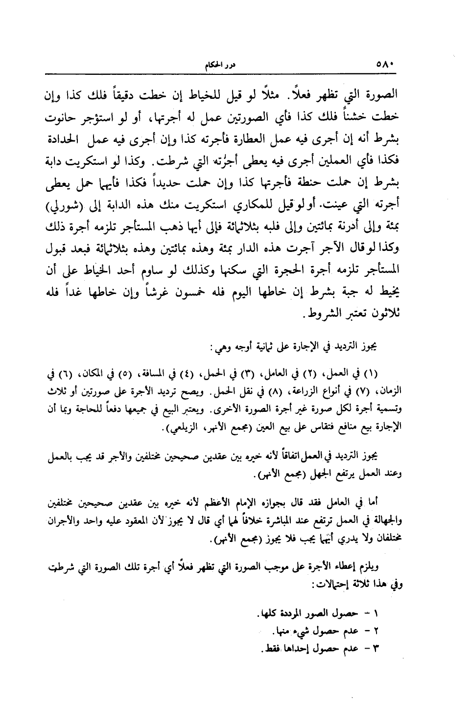 الصُّورَةِ الَّتِي تَظْهَرُ فِعْلًا. مَثَلًا لَوْ قِيلَ لِلْخَيَّاطِ إنَّ خِطْت دَقِيقًا فَلَكَ كَذَا وَإِنْ خِطْت خَشِنًا فَلَكَ كَذَا، فَأَيُّ الصُّورَتَيْنِ عَمِلَ لَهُ أُجْرَتُهَا، أَوْ لَوْ اُسْتُؤْجِرَ حَانُوتٌ بِشَرْطِ أَنَّهُ إنْ أَجْرَى فِيهِ عَمَلَ الْعِطَارَةِ فَأُجْرَتُهُ كَذَا وَإِنْ أَجْرَى فِيهِ عَمَلُ الْحِدَادَةِ فَكَذَا فَأَيُّ الْعَمَلَيْنِ أَجْرَى فِيهِ يُعْطِي أُجْرَتُهُ الَّتِي شُرِطَتْ. وَكَذَا لَوْ اُسْتُكْرِيَتْ دَابَّةٌ بِشَرْطِ إنْ حَمَلَتْ حِنْطَةً فَأُجْرَتُهَا كَذَا وَإِنْ حَمَلَتْ حَدِيدًا فَكَذَا، فَأَيُّهُمَا حُمِلَ يُعْطَى أُجْرَتُهُ الَّتِي عُيِّنَتْ. أَوْ لَوْ قِيلَ لِلْمُكَارِي اسْتَكْرَيْتُ مِنْك هَذِهِ الدَّابَّةَ إلَى (شورلي) بِمِائَةٍ وَإِلَى أَدْرِنَةٍ بِمِائَتَيْنِ وَإِلَى فلبه بِثَلَاثِمِائَةٍ فَإِلَى أَيُّهَا ذَهَبَ الْمُسْتَأْجِرُ تَلْزَمُهُ أُجْرَةُ ذَلِكَ وَكَذَا لَوْ قَالَ الْآجِرُ أَجَرْت هَذِهِ الدَّارَ بِمِائَةٍ وَهَذِهِ بِمِائَتَيْنِ وَهَذِهِ بِثَلَاثِمِائَةٍ فَبَعْدَ قَبُولِ الْمُسْتَأْجِرِ تَلْزَمُهُ أُجْرَةُ الْحُجْرَةِ الَّتِي سَكَنَهَا وَكَذَلِكَ لَوْ سَاوَمَ أَحَدٌ الْخَيَّاطَ عَلَى أَنْ يَخِيطَ لَهُ جُبَّةً بِشَرْطِ إنْ خَاطَهَا الْيَوْمَ فَلَهُ خَمْسُونَ قِرْشًا وَإِنْ خَاطَهَا غَدًا فَلَهُ ثَلَاثُونَ تُعْتَبَرُ الشُّرُوطُ.