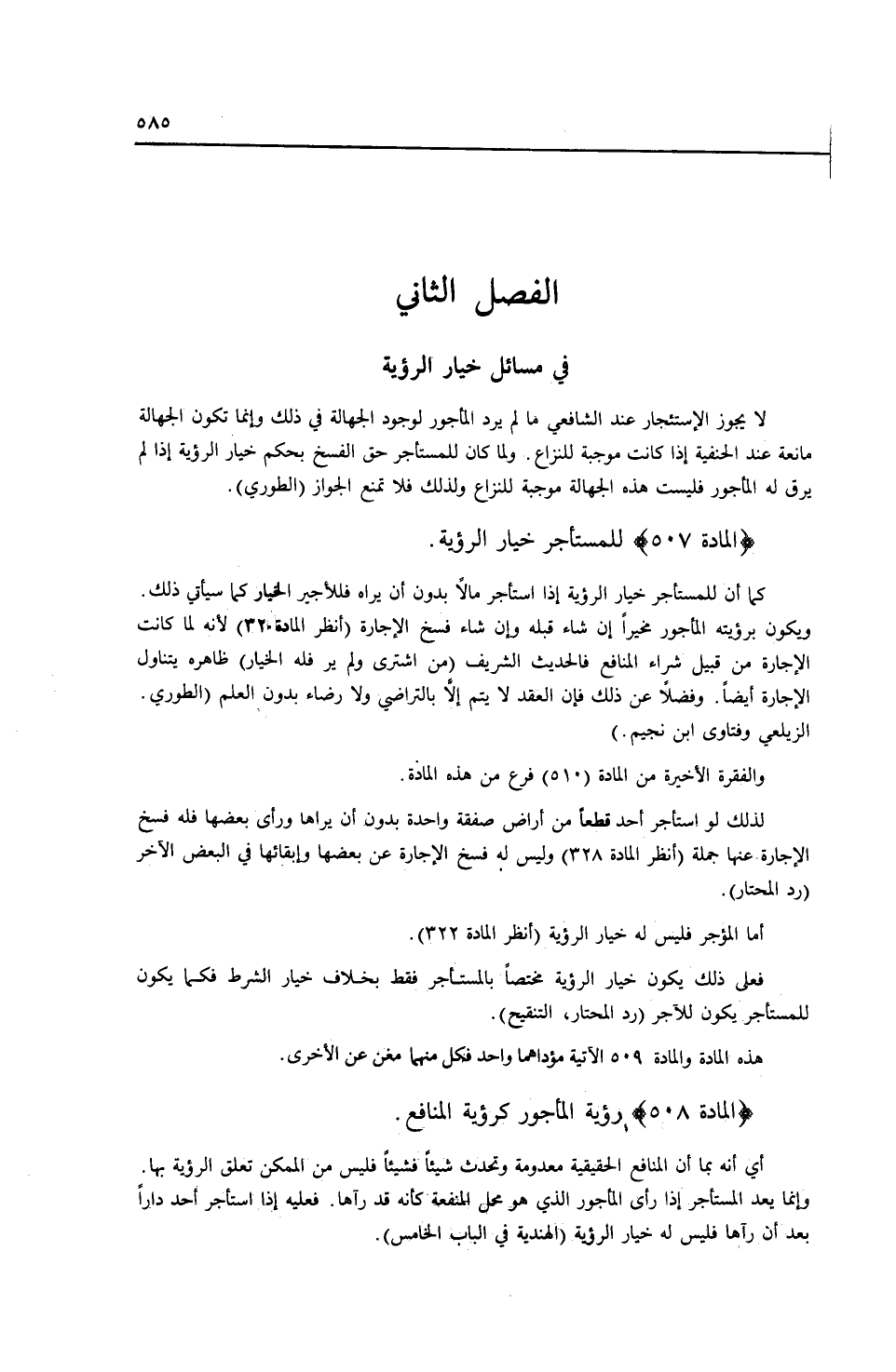 (الْمَادَّةُ 507) لِلْمُسْتَأْجِرِ خِيَارُ الرُّؤْيَةِ. كَمَا أَنَّ لِلْمُسْتَأْجِرِ خِيَارَ الرُّؤْيَةِ إذَا اسْتَأْجَرَ مَالًا بِدُونِ أَنْ يَرَاهُ فَلِلْأَجِيرِ الْخِيَارُ كَمَا سَيَأْتِي ذَلِكَ. وَيَكُونُ بِرُؤْيَتِهِ الْمَأْجُورَ مُخَيَّرًا إنْ شَاءَ قَبِلَهُ وَإِنْ شَاءَ فَسَخَ الْإِجَارَةَ (اُنْظُرْ الْمَادَّةَ 320) لِأَنَّهُ لَمَّا كَانَتْ الْإِجَارَةُ مِنْ قَبِيلِ شِرَاءِ الْمَنَافِعِ فَالْحَدِيثُ الشَّرِيفُ «مَنْ اشْتَرَى وَلَمْ يَرَ فَلَهُ الْخِيَارُ» ظَاهِرُهُ يَتَنَاوَلُ الْإِجَارَةَ أَيْضًا. وَفَضْلًا عَنْ ذَلِكَ فَإِنَّ الْعَقْدَ لَا يَتِمُّ إلَّا بِالتَّرَاضِي وَلَا رِضَاءَ بِدُونِ الْعِلْمِ (الطُّورِيُّ، الزَّيْلَعِيّ وَفَتَاوَى ابْنِ نُجَيْمٍ) .