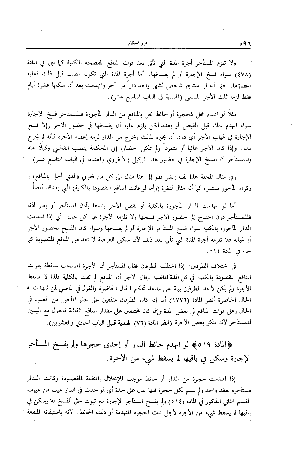 (الْمَادَّةُ 519) لَوْ انْهَدَمَ حَائِطُ الدَّارِ أَوْ إحْدَى حُجَرِهَا وَلَمْ يَفْسَخْ الْمُسْتَأْجِرُ الْإِجَارَةَ وَسَكَنَ فِي بَاقِيهَا لَمْ يَسْقُطْ شَيْءٌ مِنْ الْأُجْرَةِ.