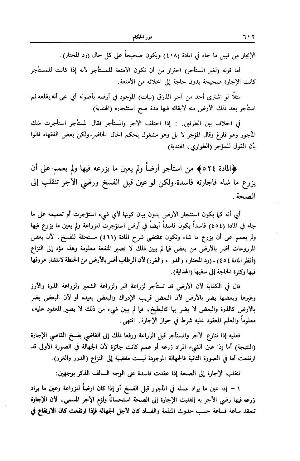 أَيْ إنَّهُ كَمَا يَكُونُ اسْتِئْجَارُ الْأَرْضِ بِدُونِ بَيَانِ كَوْنِهَا لِأَيِّ شَيْءٍ اُسْتُؤْجِرَتْ أَوْ تَعْمِيمُهُ عَلَى مَا جَاءَ فِي الْمَادَّةِ (454) فَاسِدًا يَكُونُ فَاسِدًا أَيْضًا فِي أَرْضٍ اُسْتُؤْجِرَتْ لِلزِّرَاعَةِ وَلَمْ يُعَيِّنْ مَا يَزْرَعُ فِيهَا وَلَمْ يُعَمِّمْ عَلَى أَنْ يَزْرَعَ مَا شَاءَ وَتَكُونُ بِمُقْتَضَى شَرْحِ الْمَادَّةِ (461) مُسْتَحِقَّةً لِلْفَسْخِ؛ لِأَنَّ بَعْضَ الْمَزْرُوعَاتِ أَضَرُّ بِالْأَرْضِ مِنْ بَعْضٍ فَمَا لَمْ يُبَيِّنْ ذَلِكَ لَا تَصِيرُ الْمَنْفَعَةُ مَعْلُومَةً وَهَذَا مُؤَدٍّ إلَى النِّزَاعِ (اُنْظُرْ الْمَادَّةَ 454) - (رَدُّ الْمُحْتَارِ، وَالدُّرَرُ، وَالْغُرَرُ) لِأَنَّ الرِّطَابَ أَضَرُّ بِالْأَرْضِ مِنْ الْحِنْطَةِ لِانْتِشَارِ عُرُوقِهَا فِيهَا وَكَثْرَةِ الْحَاجَةِ إلَى سَقْيِهَا (الْهِدَايَةُ) .