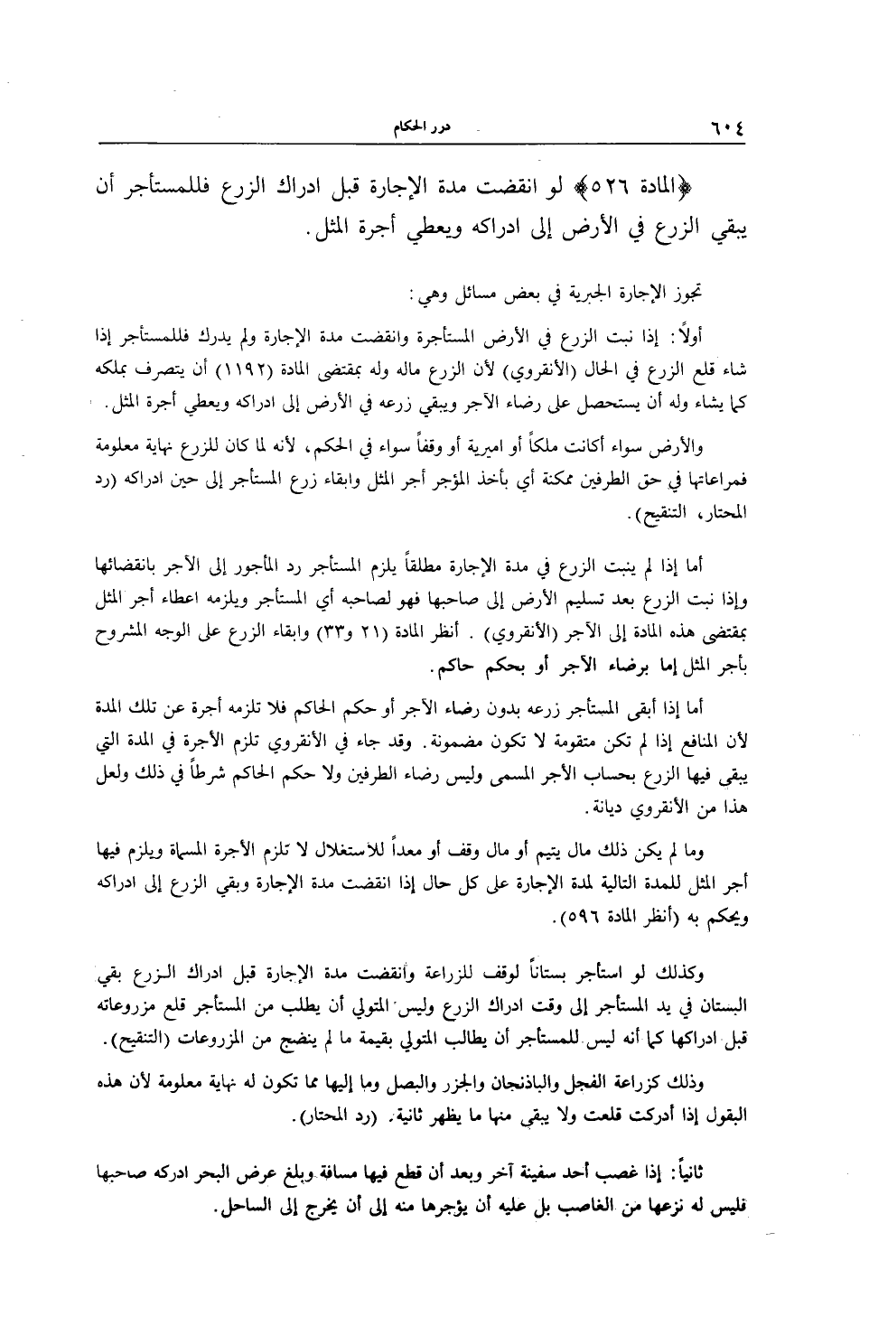 اُنْظُرْ الْمَادَّةَ (21 وَ 33) وَإِبْقَاءُ الزَّرْعِ عَلَى الْوَجْهِ الْمَشْرُوحِ بِأَجْرِ الْمِثْلِ إمَّا بِرِضَاءِ الْآجِرِ أَوْ بِحُكْمِ حَاكِمٍ.