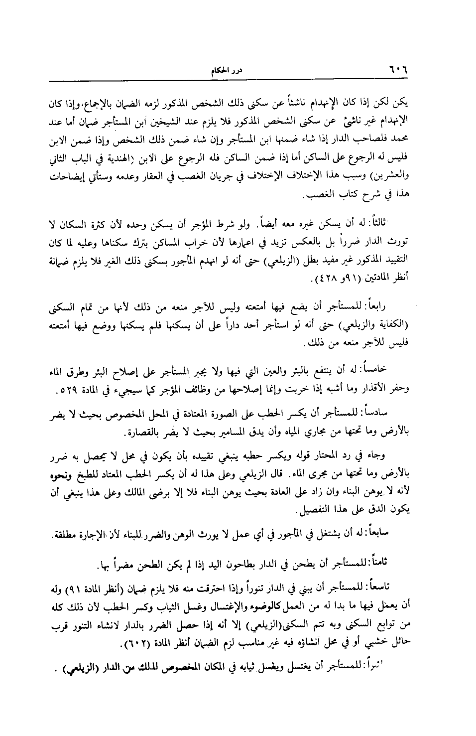 وَلَوْ شَرَطَ الْمُؤَجِّرُ أَنْ يَسْكُنَ وَحْدَهُ لِأَنَّ كَثْرَةَ السُّكَّانِ لَا تُورِثُ الدَّارَ ضَرَرًا بَلْ الْعَكْسُ تَزِيدُ فِي إعْمَارِهَا لِأَنَّ خَرَابَ الْمَسَاكِنِ بِتَرْكِ سُكْنَاهَا وَعَلَيْهِ لَمَّا كَانَ التَّقْيِيدُ الْمَذْكُورُ غَيْرَ مُفِيدٍ بَطَلَ (الزَّيْلَعِيّ) حَتَّى إنَّهُ لَوْ انْهَدَمَ الْمَأْجُورُ بِسُكْنَى ذَلِكَ الْغَيْرِ فَلَا تَلْزَمُ ضَمَانُهُ اُنْظُرْ الْمَادَّتَيْنِ (91 و 428) .