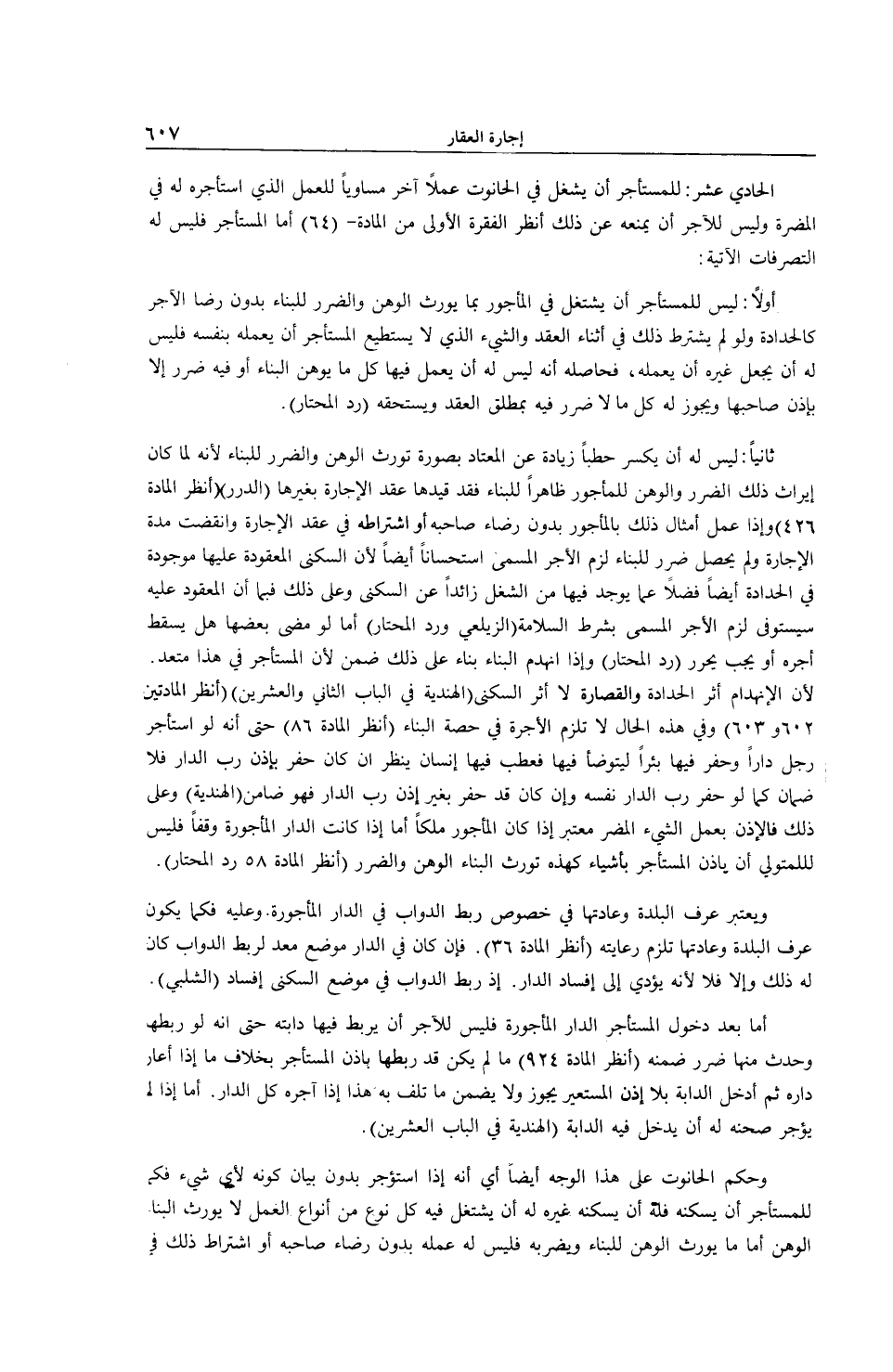 ثَانِيًا: لَيْسَ لَهُ أَنْ يَكْسِرَ حَطَبًا زِيَادَةً عَنْ الْمُعْتَادِ بِصُورَةٍ تُورِثُ الْوَهْنَ وَالضَّرَرَ لِلْبِنَاءِ لِأَنَّهُ لَمَّا كَانَ إيرَاثُ ذَلِكَ الضَّرَرِ وَالْوَهْنِ لِلْمَأْجُورِ ظَاهِرًا لِلْبِنَاءِ فَقَدْ قَيَّدَهَا عَقْدُ الْإِجَارَةِ بِغَيْرِهَا (الدُّرَرُ) (اُنْظُرْ الْمَادَّةَ 426) وَإِذَا عَمِلَ أَمْثَالَ ذَلِكَ بِالْمَأْجُورِ بِدُونِ رِضَاءِ صَاحِبِهِ أَوْ اشْتِرَاطِهِ فِي عَقْدِ الْإِجَارَةِ وَانْقَضَتْ مُدَّةُ الْإِجَارَةِ وَلَمْ يَحْصُلْ ضَرَرٌ لِلْبِنَاءِ لَزِمَ الْأَجْرُ الْمُسَمَّى اسْتِحْسَانًا أَيْضًا لِأَنَّ السُّكْنَى الْمَعْقُودَةَ عَلَيْهَا مَوْجُودَةٌ فِي الْحِدَادَةِ أَيْضًا فَضْلًا عَمَّا يُوجَدُ فِيهَا مِنْ الشَّغْلِ زَائِدًا عَنْ السُّكْنَى، وَعَلَى ذَلِكَ فَبِمَا أَنَّ الْمَعْقُودَ عَلَيْهِ سَيُسْتَوْفَى لَزِمَ الْأَجْرُ الْمُسَمَّى بِشَرْطِ السَّلَامَةِ (الزَّيْلَعِيّ وَرَدُّ الْمُحْتَارِ) أَمَّا لَوْ مَضَى بَعْضُهَا هَلْ يَسْقُطُ أَجْرُهُ أَوْ يَجِبُ؟ يُحَرَّرُ (رَدُّ الْمُحْتَارِ) وَإِذَا انْهَدَمَ الْبِنَاءُ بِنَاءً عَلَى ذَلِكَ ضَمِنَ لِأَنَّ الْمُسْتَأْجِرَ فِي هَذَا مُتَعَدٍّ لِأَنَّ الِانْهِدَامَ أَثَرُ الْحِدَادَةِ وَالْقِصَارَةِ لَا أَثَرُ السُّكْنَى (الْهِنْدِيَّةُ فِي الْبَابِ الثَّانِي وَالْعِشْرِينَ) (اُنْظُرْ الْمَادَّتَيْنِ 602 وَ 603) وَفِي هَذِهِ الْحَالِ لَا تَلْزَمُ الْأُجْرَةُ فِي حِصَّةِ الْبِنَاءِ (اُنْظُرْ الْمَادَّةَ 86) حَتَّى إنَّهُ لَوْ اسْتَأْجَرَ رَجُلٌ دَارًا وَحَفَرَ فِيهَا بِئْرًا لِيَتَوَضَّأَ فِيهَا فَعَطِبَ فِيهَا إنْسَانٌ يَنْظُرُ إنْ كَانَ حَفَرَ بِإِذْنِ رَبِّ الدَّارِ فَلَا ضَمَانَ كَمَا لَوْ حَفَرَ رَبُّ الدَّارِ نَفْسُهُ، وَإِنْ كَانَ قَدْ حَفَرَ بِغَيْرِ إذْنِ رَبِّ الدَّارِ فَهُوَ ضَامِنٌ (الْهِنْدِيَّةُ) وَعَلَى ذَلِكَ فَالْإِذْنُ بِعَمَلِ الشَّيْءِ الْمُضِرِّ مُعْتَبَرٌ إذَا كَانَ الْمَأْجُورُ مِلْكًا أَمَّا إذَا كَانَتْ الدَّارُ الْمَأْجُورَةُ وَقْفًا فَلَيْسَ لِلْمُتَوَلِّي أَنْ يَأْذَنَ الْمُسْتَأْجِرَ بِأَشْيَاءَ كَهَذِهِ تُورِثُ الْبِنَاءَ الْوَهْنَ وَالضَّرَرَ (اُنْظُرْ الْمَادَّةَ 58 رَدُّ الْمُحْتَارِ) .