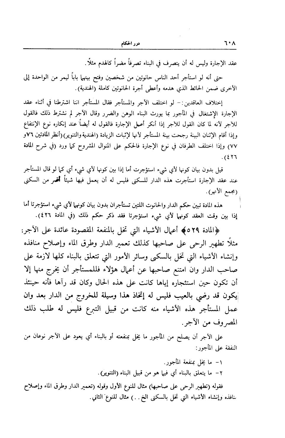 (الْمَادَّةُ 529) أَعْمَالُ الْأَشْيَاءِ الَّتِي تُخِلُّ بِالْمَنْفَعَةِ الْمَقْصُودَةِ عَائِدَةٌ عَلَى الْآجِرِ: مَثَلًا تَطْهِيرُ الرَّحَى عَلَى صَاحِبِهَا، كَذَلِكَ تَعْمِيرُ الدَّارِ وَطُرُقُ الْمَاءِ وَإِصْلَاحُ مَنَافِذِهِ وَإِنْشَاءُ الْأَشْيَاءِ الَّتِي تُخِلُّ بِالسُّكْنَى وَسَائِرُ الْأُمُورِ الَّتِي تَتَعَلَّقُ بِالْبِنَاءِ كُلِّهَا لَازِمَةٌ عَلَى صَاحِبِ الدَّارِ وَإِنْ امْتَنَعَ صَاحِبُهَا عَنْ أَعْمَالِ هَؤُلَاءِ فَلِلْمُسْتَأْجِرِ أَنْ يَخْرُجَ مِنْهَا إلَّا أَنْ تَكُونَ حِينَ اسْتِئْجَارِهِ إيَّاهَا كَانَتْ عَلَى هَذِهِ الْحَالِ وَكَانَ قَدْ رَآهَا فَإِنَّهُ حِينَئِذٍ يَكُونُ قَدْ رَضِيَ بِالْعَيْبِ فَلَيْسَ لَهُ اتِّخَاذُ هَذَا وَسِيلَةً لِلْخُرُوجِ مِنْ الدَّارِ بَعْدُ وَإِنْ عَمِلَ الْمُسْتَأْجِرُ هَذِهِ الْأَشْيَاءَ مِنْهُ كَانَتْ مِنْ قَبِيلِ التَّبَرُّعِ فَلَيْسَ لَهُ طَلَبُ ذَلِكَ الْمَصْرُوفِ مِنْ الْآجِرِ.