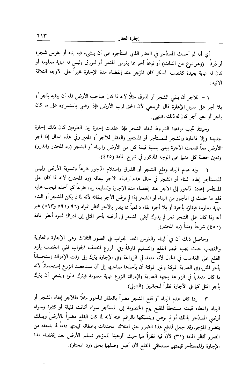 3 - إذَا كَانَ هَدْمُ الْبِنَاءِ أَوْ قَلْعُ الشَّجَرِ مُضِرًّا بِالْعَقَارِ الْمَأْجُورِ مَثَلًا فَلِلْآجِرِ إبْقَاءُ الشَّجَرِ أَوْ الْبِنَاءِ وَإِعْطَاءُ قِيمَتِهِ مُسْتَحَقًّا لِلْقَلْعِ يَوْمَ الْخُصُومَةِ إلَى الْمُسْتَأْجِرِ سَوَاءٌ أَكَانَتْ قَلِيلَةً أَوْ كَثِيرَةً وَسَوَاءٌ أَرَضِيَ الْمُسْتَأْجِرُ بِذَلِكَ أَوْ لَمْ يَرْضَ وَيَتَمَلَّكُهَا بِالرَّغْمِ عَنْهُ لِأَنَّهُ لَمَّا كَانَ الْقَلْعُ مُضِرًّا بِالْأَرْضِ وَبِذَلِكَ يَتَضَرَّرُ الْمُؤَجِّرُ.