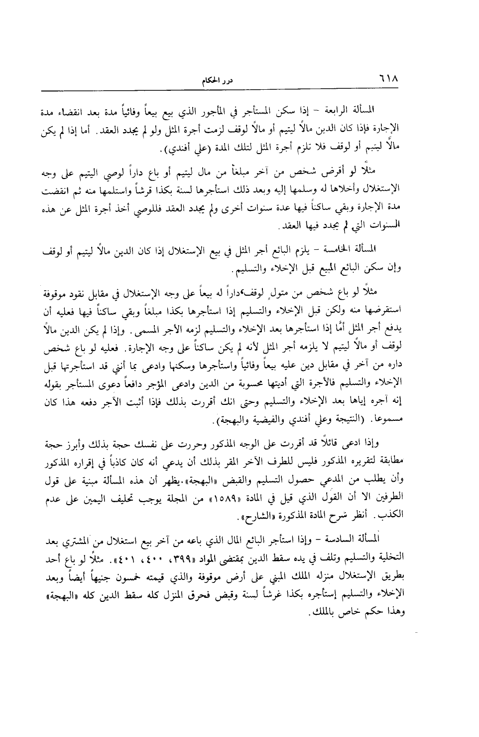 مَثَلًا لَوْ بَاعَ شَخْصٌ مِنْ مُتَوَلٍّ لِوَقْفٍ دَارًا لَهُ بَيْعًا عَلَى وَجْهِ الِاسْتِغْلَالِ فِي مُقَابِلِ نُقُودٍ مَوْقُوفَةٍ اسْتَقْرَضَهَا مِنْهُ وَلَكِنْ قَبْلَ الْإِخْلَاءِ وَالتَّسْلِيمِ إذَا اسْتَأْجَرَهَا بِكَذَا مَبْلَغًا وَبَقِيَ سَاكِنًا فِيهَا فَعَلَيْهِ أَنْ يَدْفَعَ أَجْرَ الْمِثْلِ أَمَّا إذَا اسْتَأْجَرَهَا بَعْدَ الْإِخْلَاءِ وَالتَّسْلِيمِ لَزِمَهُ الْأَجْرُ الْمُسَمَّى. وَإِذَا لَمْ يَكُنْ الدَّيْنُ مَالًا لِوَقْفٍ أَوْ مَالًا لِيَتِيمٍ لَا يَلْزَمُهُ أَجْرُ الْمِثْلِ لِأَنَّهُ لَمْ يَكُنْ سَاكِنًا عَلَى وَجْهِ الْإِجَارَةِ. فَعَلَيْهِ لَوْ بَاعَ شَخْصٌ دَارِهِ مِنْ آخَرَ فِي مُقَابِلِ دَيْنٍ عَلَيْهِ بَيْعًا وَفَائِيًّا وَاسْتَأْجَرَهَا وَسَكَنَهَا وَادَّعَى بِمَا أَنَّنِي قَدْ اسْتَأْجَرْتُهَا قَبْلَ الْإِخْلَاءِ وَالتَّسْلِيمِ فَالْأُجْرَةُ الَّتِي أَدَّيْتهَا مَحْسُوبَةٌ مِنْ الدَّيْنِ وَادَّعَى الْمُؤَجِّرُ دَافِعًا دَعْوَى الْمُسْتَأْجِرِ بِقَوْلِهِ إنَّهُ أَجَرَهُ إيَّاهَا بَعْدَ الْإِخْلَاءِ وَالتَّسْلِيمِ وَحَتَّى إنَّك أَقْرَرْت بِذَلِكَ فَإِذَا أَثْبَتَ الْآجِرُ دَفْعَهُ هَذَا كَانَ مَسْمُوعًا. (النَّتِيجَةُ وَعَلِيٌّ أَفَنْدِي وَالْفَيْضِيَّةُ وَالْبَهْجَةُ) .