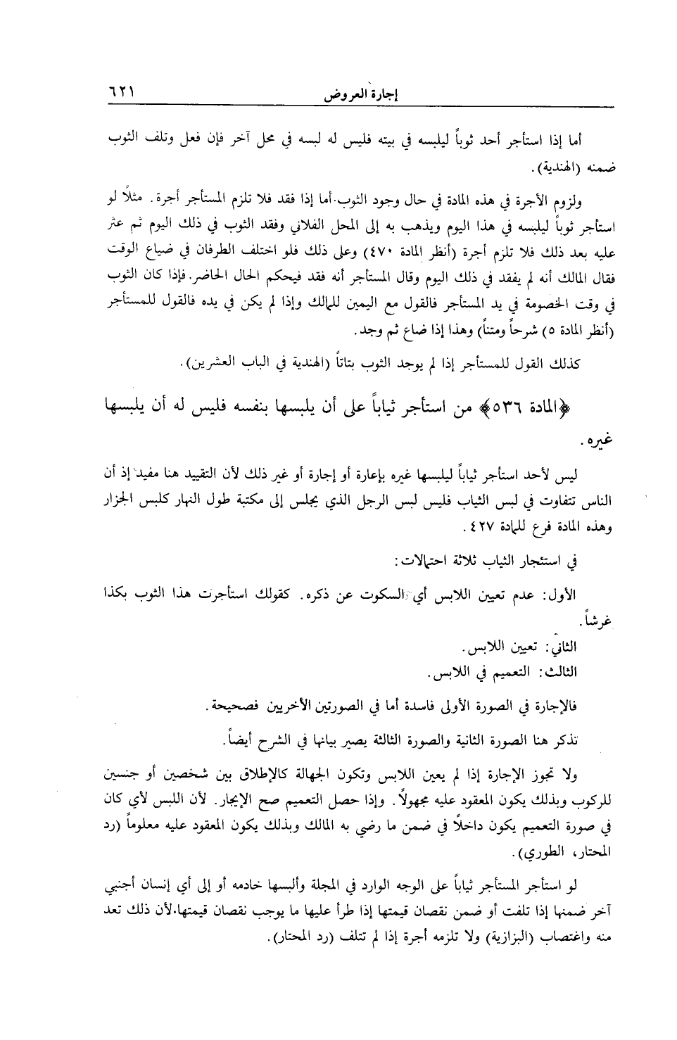 [ (الْمَادَّةُ 536) اسْتَأْجَرَ ثِيَابًا عَلَى أَنْ يَلْبَسَهَا بِنَفْسِهِ فَلَيْسَ لَهُ أَنْ يُلْبِسَهَا غَيْرَهُ]