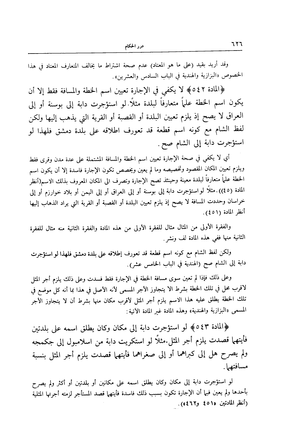 أَيْ لَا يَكْفِي فِي صِحَّةِ الْإِجَارَةِ تَعْيِينُ اسْمِ الْخُطَّةِ وَالْمَسَافَةِ الْمُشْتَمِلَةِ عَلَى عِدَّةِ مُدُنٍ وَقُرَى فَقَطْ، وَيَلْزَمُ تَعْيِينُ الْمَكَانِ الْمَقْصُودِ وَتَخْصِيصِهِ، وَمَا لَمْ يُعَيَّنْ وَيُخَصَّصْ؛ تَكُونُ الْإِجَارَةُ فَاسِدَةً إلَّا أَنْ يَكُونَ اسْمُ الْخُطَّةِ عَلَمًا مُتَعَارَفًا لِبَلْدَةٍ مُعَيَّنَةٍ وَحِينَئِذٍ تَصِحُّ الْإِجَارَةُ وَتُصْرَفُ إلَى الْمَكَانِ الْمَعْرُوفِ بِذَلِكَ الِاسْمِ (اُنْظُرْ الْمَادَّةَ (45)) .