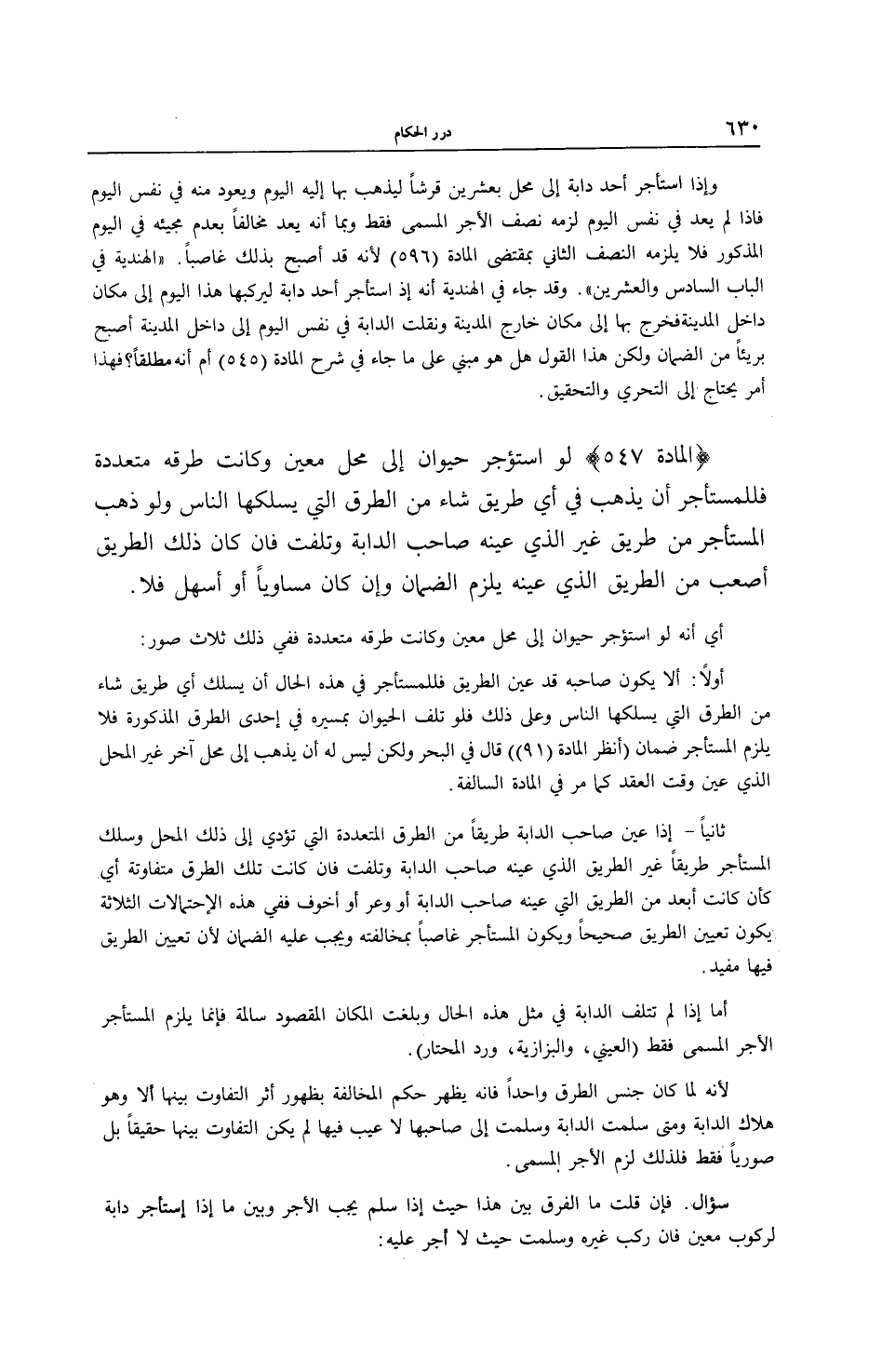 (الْمَادَّةُ 547) لَوْ اُسْتُؤْجِرَ حَيَوَانٌ إلَى مَحَلٍّ مُعَيَّنٍ وَكَانَتْ طُرُقُهُ مُتَعَدِّدَةً فَلِلْمُسْتَأْجِرِ أَنْ يَذْهَبَ فِي أَيِّ طَرِيقٍ شَاءَ مِنْ الطُّرُقِ الَّتِي يَسْلُكُهَا النَّاسُ وَلَوْ ذَهَبَ الْمُسْتَأْجِرُ مِنْ طَرِيقٍ غَيْرِ الَّذِي عَيَّنَهُ صَاحِبُ الدَّابَّةِ وَتَلِفَتْ فَإِنْ كَانَ ذَلِكَ الطَّرِيقُ أَصْعَبَ مِنْ الطَّرِيقِ الَّذِي عَيَّنَهُ يَلْزَمُ الضَّمَانُ وَإِنْ كَانَ مُسَاوِيًا أَوْ أَسْهَلَ فَلَا.