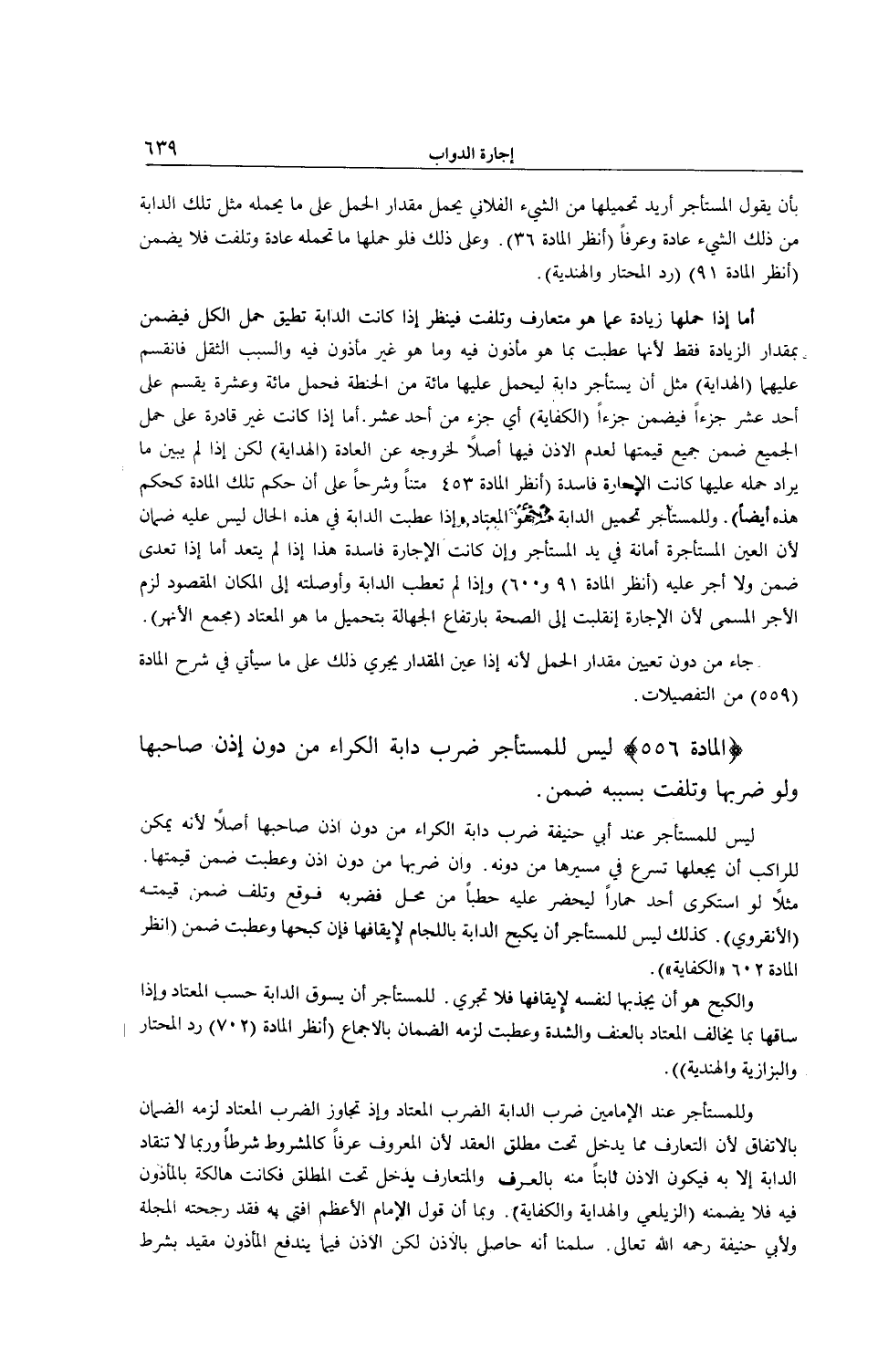 (الْمَادَّةُ 556) لَيْسَ لِلْمُسْتَأْجِرِ ضَرْبُ دَابَّةِ الْكِرَاءِ مِنْ دُونِ إذْنِ صَاحِبِهَا وَلَوْ ضَرَبَهَا وَتَلِفَتْ بِسَبَبِهِ ضَمِنَ. لَيْسَ لِلْمُسْتَأْجِرِ عِنْدَ أَبِي حَنِيفَةَ ضَرْبُ دَابَّةِ الْكِرَاءِ مِنْ دُونِ إذْنِ صَاحِبِهَا أَصْلًا لِأَنَّهُ يُمْكِنْ لِلرَّاكِبِ أَنْ يَجْعَلَهَا تُسْرِعُ فِي مَسِيرِهَا مِنْ دُونِهِ. وَإِنْ ضَرَبَهَا مِنْ دُونِ إذْنٍ وَعَطِبَتْ ضَمِنَ قِيمَتَهَا. مَثَلًا لَوْ اسْتَكْرَى أَحَدٌ حِمَارًا لِيُحْضِرَ عَلَيْهِ حَطَبًا مِنْ مَحَلٍّ فَضَرَبَهُ فَوَقَعَ وَتَلِفَ ضَمِنَ قِيمَتَهُ (الْأَنْقِرْوِيّ) .