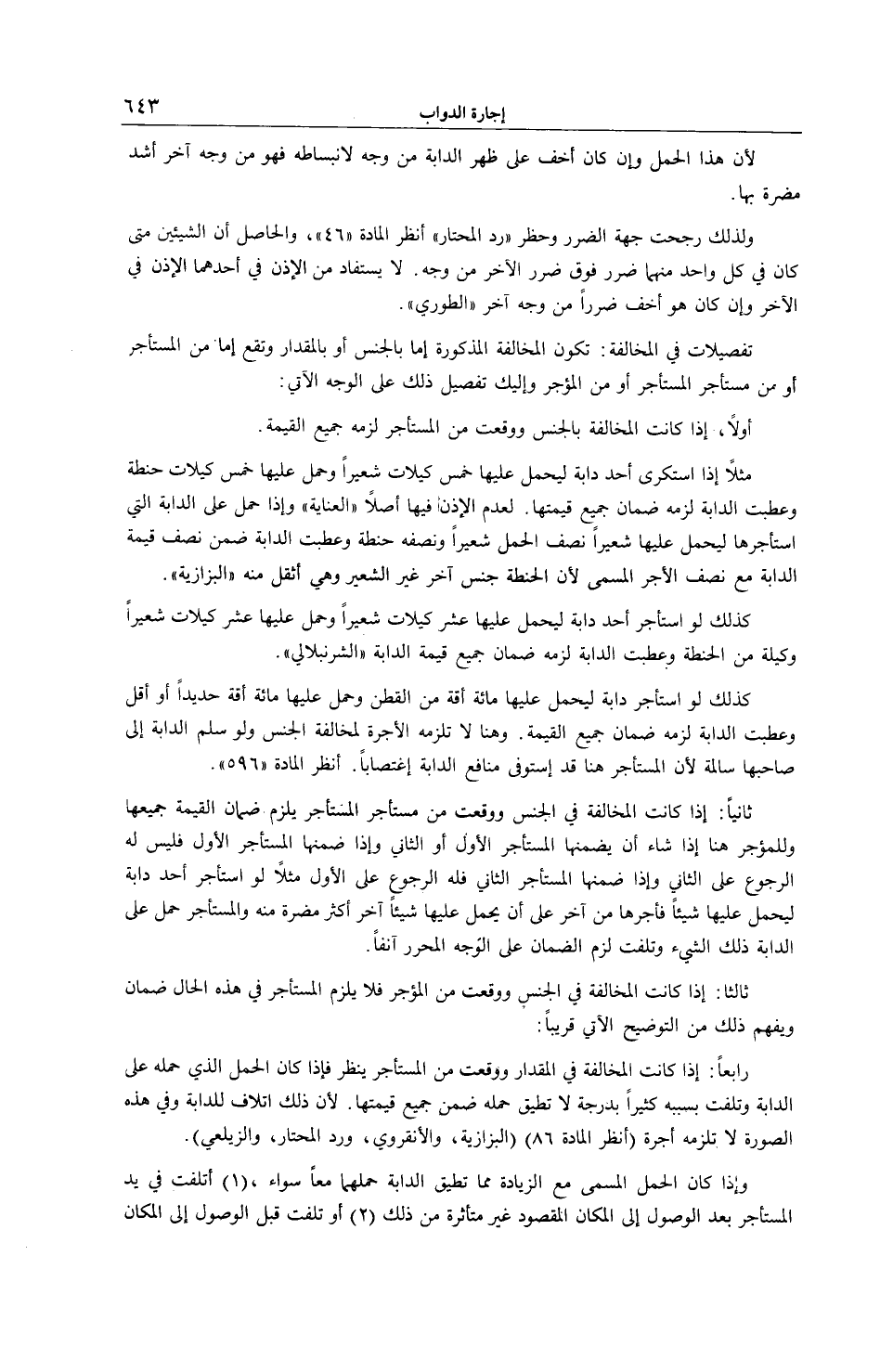 رَابِعًا: إذَا كَانَتْ الْمُخَالَفَةُ فِي مِقْدَارٍ وَوَقَعَتْ مِنْ الْمُسْتَأْجِرِ يُنْظَرُ فَإِذَا كَانَ الْحِمْلُ الَّذِي حَمَلَهُ عَلَى الدَّابَّةِ وَتَلِفَتْ بِسَبَبِهِ كَثِيرًا بِدَرَجَةٍ لَا تُطِيقُ حَمْلَهُ ضَمِنَ جَمِيعَ قِيمَتِهَا؛ لِأَنَّ ذَلِكَ إتْلَافٌ لِلدَّابَّةِ وَفِي هَذِهِ الصُّورَةِ لَا تَلْزَمُهُ أُجْرَةٌ (اُنْظُرْ الْمَادَّةَ 86) (الْبَزَّازِيَّةُ، وَالْأَنْقِرْوِيّ، وَرَدُّ الْمُحْتَارِ، وَالزَّيْلَعِيّ) .