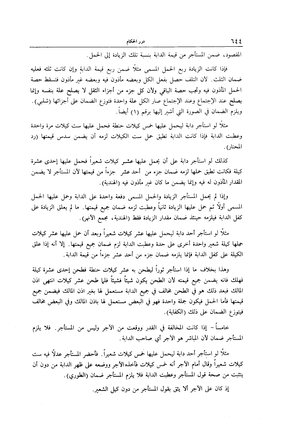 مَثَلًا: لَوْ اسْتَأْجَرَ دَابَّةً لِيَحْمِلَ خَمْسَ كَيْلَاتِ حِنْطَةٍ فَحَمَلَ عَلَيْهَا سِتَّ كَيْلَاتٍ مَرَّةً وَاحِدَةً وَعَطِبَتْ الدَّابَّةُ فَإِذَا كَانَتْ الدَّابَّةُ تُطِيقُ حَمْلَ سِتِّ كَيْلَاتٍ لَزِمَهُ أَنْ يَضْمَنَ سُدُسَ قِيمَتِهَا (رَدُّ الْمُحْتَارِ) .