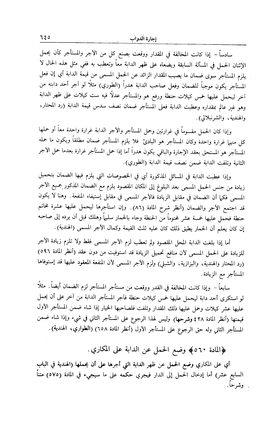 (الْمَادَّةُ 560) وَضَعَ الْحِمْلَ عَنْ الدَّابَّةِ عَلَى الْمُكَارِي. أَيْ عَلَى الْمُكَارِي وَضْعُ الْحِمْلِ عَنْ ظُهْرِ الدَّابَّةِ الَّتِي أَجَّرَهَا عَلَى أَنْ يُحَمِّلَهَا (الْهِنْدِيَّةُ فِي الْبَابِ السَّابِعَ عَشَرَ) أَمَّا إدْخَالُ الْحَمْلِ إلَى الدَّارِ فَيَجْرِي حُكْمُهُ عَلَى مَا سَيَجِيءُ فِي الْمَادَّةِ (575) مَتْنًا وَشَرْحًا. (الْمَادَّةُ 561) نَفَقَةُ الْمَأْجُورِ عَلَى الْآخَرِ