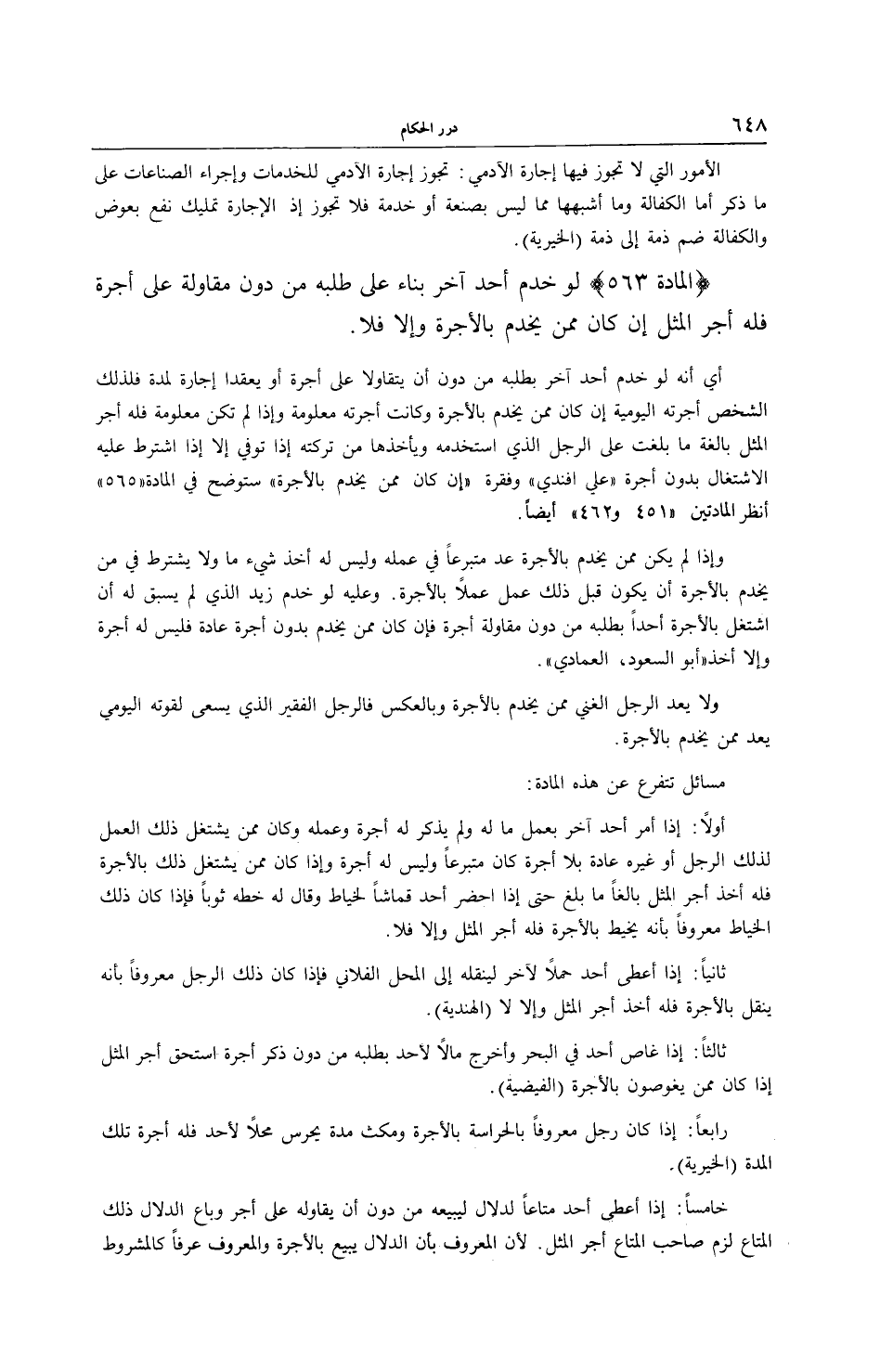 (الْمَادَّةُ 563) لَوْ خَدَمَ أَحَدٌ آخَرَ بِنَاءً عَلَى طَلَبِهِ مِنْ دُونِ مُقَاوَلَةٍ عَلَى أُجْرَةٍ فَلَهُ أَجْرُ الْمِثْلِ إنْ كَانَ مِمَّنْ يَخْدُمُ بِالْأُجْرَةِ وَإِلَّا فَلَا، أَيْ أَنَّهُ لَوْ خَدَمَ أَحَدٌ آخَرَ بِطَلَبِهِ مِنْ دُونِ أَنْ يَتَقَاوَلَا عَلَى أُجْرَةٍ أَوْ يَعْقِدَا إجَارَةً لِمُدَّةٍ، فَلِذَلِكَ الشَّخْصُ أُجْرَتُهُ الْيَوْمِيَّةُ إنْ كَانَ مِمَّنْ يَخْدُمُ بِالْأُجْرَةِ، وَكَانَتْ أُجْرَتُهُ مَعْلُومَةً، وَإِذَا لَمْ تَكُنْ مَعْلُومَةً فَلَهُ أَجْرُ الْمِثْلِ بَالِغَةً مَا بَلَغَتْ عَلَى الرَّجُلِ الَّذِي اسْتَخْدَمَهُ، وَيَأْخُذُهَا مِنْ تَرِكَتِهِ إذَا تُوُفِّيَ إلَّا إذَا اشْتَرَطَ عَلَيْهِ الِاشْتِغَالَ بِدُونِ أُجْرَةٍ " عَلِيٌّ أَفَنْدِي " وَفِقْرَةُ " إنْ كَانَ مِمَّنْ يَخْدُمُ بِالْأُجْرَةِ " سَتُوَضَّحُ فِي الْمَادَّةِ " 565 " اُنْظُرْ الْمَادَّتَيْنِ " 451 و 462 " أَيْضًا. وَإِذَا لَمْ يَكُنْ مِمَّنْ يَخْدُمُ بِالْأُجْرَةِ عُدَّ مُتَبَرِّعًا فِي عَمَلِهِ وَلَيْسَ لَهُ أَخْذُ شَيْءٍ مَا، وَلَا يُشْتَرَطُ فِي مَنْ يَخْدُمُ بِالْأُجْرَةِ أَنْ يَكُونَ قَبْلَ ذَلِكَ عَمِلَ عَمَلًا بِالْأُجْرَةِ. وَعَلَيْهِ لَوْ خَدَمَ زَيْدٌ الَّذِي لَمْ يَسْبِقْ لَهُ أَنْ اشْتَغَلَ بِالْأُجْرَةِ أَحَدًا بِطَلَبِهِ مِنْ دُونِ مُقَاوَلَةِ أُجْرَةٍ، فَإِنْ كَانَ مِمَّنْ يَخْدُمُ بِدُونِ أُجْرَةٍ عَادَةً فَلَيْسَ لَهُ أُجْرَةٌ وَإِلَّا أَخَذَ " أَبُو السُّعُودِ الْعِمَادِيُّ ". وَلَا يُعَدُّ الرَّجُلُ الْغَنِيُّ مِمَّنْ يَخْدُمُ بِالْأُجْرَةِ، وَبِالْعَكْسِ فَالرَّجُلُ الْفَقِيرُ الَّذِي يَسْعَى لِقُوتِهِ الْيَوْمِيِّ يُعَدُّ مِمَّنْ يَخْدُمُ بِالْأُجْرَةِ. مَسَائِلُ تَتَفَرَّعُ عَنْ هَذِهِ الْمَادَّةِ:
