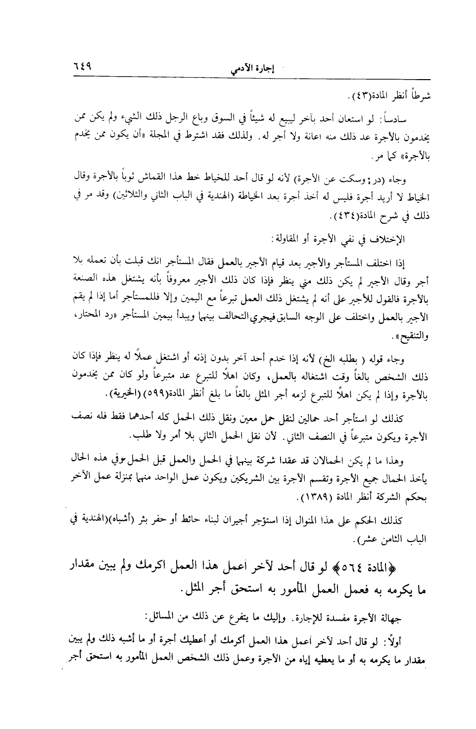 (الْمَادَّةُ 564) لَوْ قَالَ أَحَدٌ لِآخَرَ: اعْمَلْ هَذَا الْعَمَلَ أُكْرِمْكَ، وَلَمْ يُبَيِّنْ مِقْدَارَ مَا يُكْرِمُهُ بِهِ فَعَمِلَ الْعَمَلَ الْمَأْمُورَ بِهِ اسْتَحَقَّ أَجْرَ الْمِثْلِ. جَهَالَةُ الْأُجْرَةِ مُفْسِدَةٌ لِلْإِجَارَةِ.