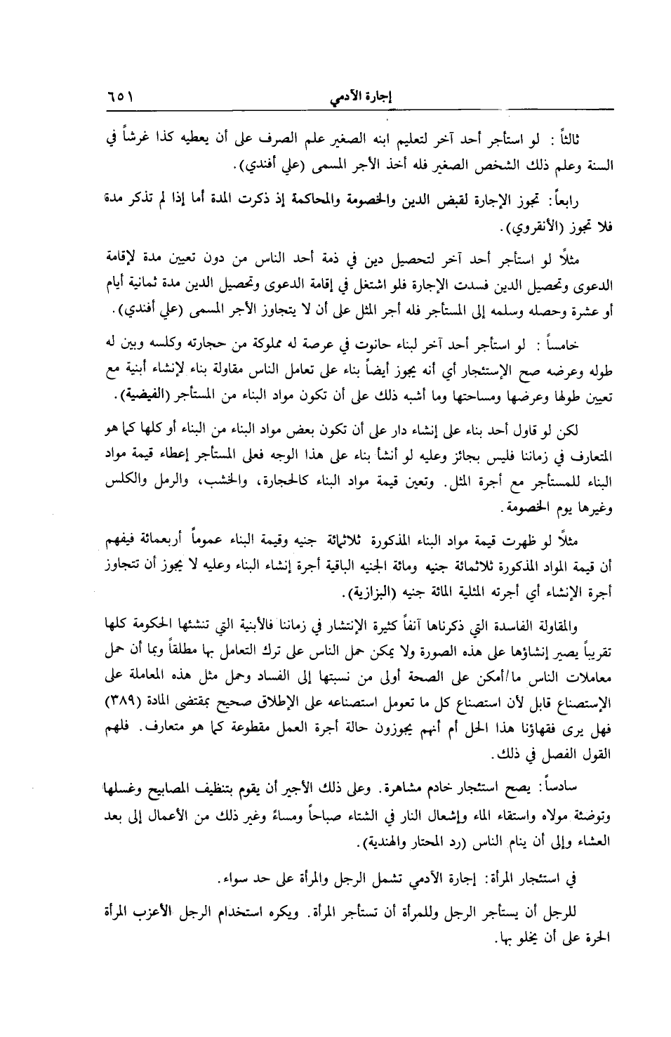 وَعَلَى ذَلِكَ الْأَجِيرِ أَنْ يَقُومَ بِتَنْظِيفِ الْمَصَابِيحِ وَغَسْلِهَا وَتَوْضِئَةِ مَوْلَاهُ وَاسْتِقَاءِ الْمَاءِ وَإِشْعَالِ النَّارِ فِي الشِّتَاءِ صَبَاحًا وَمَسَاءً وَغَيْرِ ذَلِكَ مِنْ الْأَعْمَالِ إلَى بَعْدَ الْعِشَاءِ وَإِلَى أَنْ يَنَامَ النَّاسُ (رَدُّ الْمُحْتَارِ وَالْهِنْدِيَّةُ) فِي اسْتِئْجَارِ الْمَرْأَةِ إجَارَةُ الْآدَمِيِّ تَشْمَلُ الرَّجُلَ وَالْمَرْأَةَ عَلَى حَدٍّ سَوَاءٍ. لِلرَّجُلِ أَنْ يَسْتَأْجِرَ الرَّجُلَ وَلِلْمَرْأَةِ أَنْ تَسْتَأْجِرَ الْمَرْأَةَ وَيُكْرَهُ اسْتِخْدَامُ الرَّجُلِ الْأَعْزَبِ الْمَرْأَةَ الْحُرَّةَ عَلَى أَنْ يَخْلُوَ بِهَا.