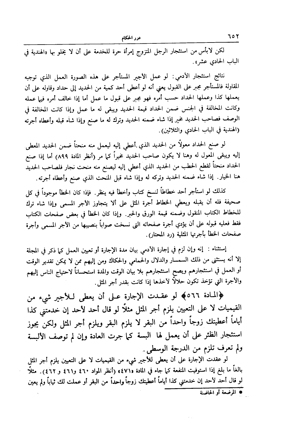 لَكِنْ لَا بَأْسَ مِنْ اسْتِئْجَارِ الرَّجُلِ الْمُتَزَوِّجِ امْرَأَةً حُرَّةً لِلْخِدْمَةِ عَلَى أَنْ لَا يَخْلُوَ بِهَا " الْهِنْدِيَّةُ فِي الْبَابِ الْحَادِيَ عَشَرَ " نَتَائِجُ اسْتِئْجَارِ الْآدَمِيِّ: لَوْ عَمِلَ الْأَجِيرُ الْمُسْتَأْجِرُ عَلَى هَذِهِ الصُّورَةِ الْعَمَلَ الَّذِي تُوجِبُهُ الْمُقَاوَلَةُ، فَالْمُسْتَأْجِرُ مُجْبَرٌ عَلَى الْقَبُولِ يَعْنِي أَنَّهُ لَوْ أَعْطَى أَحَدٌ كَمِّيَّةً مِنْ الْحَدِيدِ إلَى حَدَّادٍ، وَقَاوَلَهُ عَلَى أَنْ يَعْمَلَهَا كَذَا وَعَمَلهَا الْحَدَّادُ حَسْبَ أَمْرِهِ فَهُوَ مُجْبَرٌ عَلَى قَبُولِ مَا عَمِلَ، أَمَّا إذَا خَالَفَ أَمْرَهُ فِيمَا عَمِلَهُ، وَكَانَتْ الْمُخَالَفَةُ فِي الْجِنْسِ ضَمِنَ الْحَدَّادُ قِيمَةَ الْحَدِيدِ، وَيَبْقَى لَهُ مَا عَمِلَ، وَإِذَا كَانَتْ الْمُخَالَفَةُ فِي الْوَصْفِ فَصَاحِبُ الْحَدِيدِ مُخَيَّرٌ إذَا شَاءَ ضَمَّنَهُ الْحَدِيدَ وَتَرَكَ لَهُ مَا صَنَعَ، وَإِذَا شَاءَ قَبِلَهُ وَأَعْطَاهُ أُجْرَتَهُ (الْهِنْدِيَّةُ فِي الْبَابِ الْحَادِي وَالثَّلَاثِينَ) . لَوْ صَنَعَ الْحَدَّادُ مِعْوَلًا مِنْ الْحَدِيدِ الَّذِي أُعْطِيَ إلَيْهِ لِيَعْمَلَ مِنْهُ مِنْحَتًا ضَمِنَ الْحَدِيدَ الْمُعْطَى إلَيْهِ وَيَبْقَى الْمِعْوَلُ لَهُ وَهُنَا لَا يَكُونُ صَاحِبُ الْحَدِيدِ مُخَيَّرًا، كَمَا مَرَّ (اُنْظُرْ الْمَادَّةَ 899) أَمَّا إذَا صَنَعَ الْحَدَّادُ مِنْحَتًا لِقَطْعِ الْحَطَبِ مِنْ الْحَدِيدِ الَّذِي أُعْطِيَ إلَيْهِ لِيَصْنَعَ مِنْهُ مِنْحَتَ نَجَّارٍ فَلِصَاحِبِ الْحَدِيدِ هُنَا الْخِيَارُ إذَا شَاءَ ضَمَّنَهُ الْحَدِيدَ وَتَرَكَهُ لَهُ، وَإِذَا شَاءَ قَبِلَ الْمِنْحَتَ الَّذِي صَنَعَ وَأَعْطَاهُ أُجْرَتَهُ. كَذَلِكَ لَوْ اسْتَأْجَرَ أَحَدٌ خَطَّاطًا لِنَسْخِ كِتَابٍ وَأَخْطَأَ فِيهِ يُنْظَرُ، فَإِذَا كَانَ الْخَطَأُ مَوْجُودًا فِي كُلِّ صَحِيفَةٍ فَلَهُ أَنْ يَقْبَلَهُ وَيُعْطِي الْخَطَّاطَ أُجْرَةَ الْمِثْلِ عَلَى أَلَا يَتَجَاوَزَ الْأَجْرَ الْمُسَمَّى، وَإِذَا شَاءَ تَرَكَ لِلْخَطَّاطِ الْكِتَابَ الْمَنْقُولَ وَضَمَّنَهُ قِيمَةَ الْوَرَقِ وَالْحِبْرِ، وَإِذَا كَانَ الْخَطَأُ فِي بَعْضِ صَفَحَاتِ الْكِتَابِ فَقَطْ فَعَلَيْهِ قَبُولُهُ عَلَى أَنْ يُؤَدِّيَ أُجْرَةَ صَفَحَاتِهِ الَّتِي نُسِخَتْ صَوَابًا بِنَصِيبِهَا مِنْ الْأَجْرِ الْمُسَمَّى وَأُجْرَةَ صَفَحَاتِ الْخَطَأِ بِأُجْرَتِهَا الْمِثْلِيَّةِ (رَدُّ الْمُحْتَارِ) .