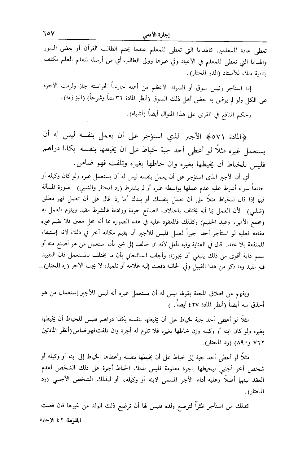 (الْمَادَّةُ 571) الْأَجِيرُ الَّذِي اُسْتُؤْجِرَ عَلَى أَنْ يَعْمَلَ بِنَفْسِهِ لَيْسَ لَهُ أَنْ يَسْتَعْمِلَ غَيْرَهُ مَثَلًا لَوْ أَعْطَى أَحَدٌ جُبَّةً لِخَيَّاطٍ عَلَى أَنْ يَخِيطهَا بِنَفْسِهِ بِكَذَا دَرَاهِمَ، فَلَيْسَ لِلْخَيَّاطِ أَنْ يَخِيطَهَا بِغَيْرِهِ وَإِنْ خَاطَهَا بِغَيْرِهِ وَتَلِفَتْ فَهُوَ ضَامِنٌ. أَيْ إنَّ الْأَجِيرَ الَّذِي اُسْتُؤْجِرَ عَلَى أَنْ يَعْمَلَ بِنَفْسِهِ لَيْسَ لَهُ أَنْ يَسْتَعْمِلَ غَيْرَهُ، وَلَوْ كَانَ وَكِيلَهُ أَوْ خَادِمًا سَوَاءٌ أَشُرِطَ عَلَيْهِ عَدَمُ عَمَلِهَا بِوَاسِطَةِ غَيْرِهِ، أَوْ لَمْ يُشْتَرَطْ (رَدُّ الْمُحْتَارِ وَالشِّبْلِيُّ) . صُورَةُ الْمَسْأَلَةِ فِيمَا إذَا قَالَ لِلْخَيَّاطِ مَثَلًا عَلَى أَنْ تَعْمَلَ بِنَفْسِكَ أَوْ بِيَدِكَ.
