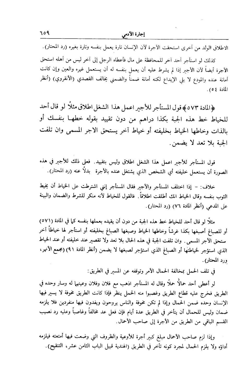 (الْمَادَّةَ 573) قَوْلُ الْمُسْتَأْجِرِ لِلْأَجِيرِ اعْمَلْ هَذَا الشَّغْلَ إطْلَاقٌ، مَثَلًا لَوْ قَالَ أَحَدٌ لِلْخَيَّاطِ خِطْ هَذِهِ الْجُبَّةَ بِكَذَا دَرَاهِمَ مِنْ دُونِ تَقْيِيدٍ بِقَوْلِهِ خِطْهَا بِنَفْسِكَ أَوْ بِالذَّاتِ وَخَاطَهَا الْخَيَّاطُ بِخَلِيفَتِهِ أَوْ خَيَّاطٍ آخَرَ يَسْتَحِقُّ الْأَجْرَ الْمُسَمَّى وَإِنْ تَلِفَتْ الْجُبَّةُ بِلَا تَعَدٍّ لَا يَضْمَنُ. قَوْلُ الْمُسْتَأْجِرِ لِلْأَجِيرِ اعْمَلْ هَذَا الشَّغْلَ إطْلَاقٌ، وَلَيْسَ بِتَقْيِيدٍ. فَعَلَى ذَلِكَ لِلْأَجِيرِ فِي هَذِهِ الصُّورَةِ أَنْ يَسْتَعْمِلَ خَلِيفَتَهُ أَيْ الشَّخْصَ الَّذِي يَشْتَغِلُ عِنْدَهُ بِالْأُجْرَةِ بَدَلًا عَنْهُ (رَدُّ الْمُحْتَارِ) . خِلَافٌ: - إذَا اخْتَلَفَ الْمُسْتَأْجِرُ وَالْأَجِيرُ، فَقَالَ الْمُسْتَأْجِرُ إنَّنِي اشْتَرَطْتُ عَلَى الْخَيَّاطِ أَنْ يَخِيطَ الثَّوْبَ بِنَفْسِهِ، وَقَالَ الْخَيَّاطُ إنَّكَ أَطْلَقْتَ إطْلَاقًا. فَالْقَوْلُ لِلْخَيَّاطِ؛ لِأَنَّهُ مُنْكِرٌ لِلشَّرْطِ وَالضَّمَانُ وَالْبَيِّنَةُ عَلَى الْمُدَّعِي (اُنْظُرْ الْمَادَّةَ 76) (رَدُّ الْمُحْتَارِ) . مَثَلًا لَوْ قَالَ أَحَدٌ لِلْخَيَّاطِ: خِطْ هَذِهِ الْجُبَّةَ مِنْ دُونِ أَنْ يُقَيِّدَهُ بِعَمَلِهَا بِنَفْسِهِ، كَمَا فِي الْمَادَّةِ (571) أَوْ لِلصَّبَّاغِ: اُصْبُغْهَا بِكَذَا غرشا وَخَاطَهَا الْخَيَّاطُ وَصَبَغَهَا الصَّبَّاغُ بِخَلِيفَتِهِ أَوْ اسْتَأْجَرَ لَهَا خَيَّاطًا آخَرَ اسْتَحَقَّ الْأَجْرَ الْمُسَمَّى. وَإِنْ تَلِفَتْ الْجُبَّةُ فِي هَذِهِ الْحَالِ بِلَا تَعَدٍّ، وَلَا تَقْصِيرٍ عِنْدَ خَلِيفَتِهِ أَوْ عِنْدَ الْخَيَّاطِ الَّذِي اُسْتُؤْجِرَ لِخِيَاطَتِهَا أَوْ الصَّبَّاغِ الَّذِي اُسْتُؤْجِرَ لِصَبْغِهَا لَا يَضْمَنُ (اُنْظُرْ الْمَادَّةَ 91) (مَجْمَعُ الْأَنْهُرِ، وَرَدُّ الْمُحْتَارِ) . فِي تَلَفِ الْحِمْلِ بِمُخَالِفَةِ الْحَمَّالِ الْأَمْرَ وَتَوَقُّفِهِ عَنْ الْمَسِيرِ فِي الطَّرِيقِ: لَوْ أَعْطَى أَحَدٌ حَمَّالًا حِمْلًا، وَقَالَ لَهُ الْمُسْتَأْجِرُ اذْهَبْ مَعَ فُلَانٍ وَفُلَانٍ وَعَيَّنَهُمَا لَهُ وَسَارَ وَحْدَهُ فِي الطَّرِيقِ فَخَرَجَ عَلَيْهِ قُطَّاعُ الطَّرِيقِ وَغَصَبُوا مِنْهُ الْحِمْلَ يُنْظَرُ، فَإِذَا كَانَتْ الطَّرِيقُ مَخُوفَةً لَا يَسِيرُ فِيهَا الْإِنْسَانُ وَحْدَهُ ضَمِنَ الْحَمَّالُ، وَإِذَا لَمْ تَكُنْ مَخُوفَةً وَالنَّاسُ يَرُوحُونَ وَيَفِدُونَ فِيهَا مُنْفَرِدِينَ، فَلَا يَلْزَمُهُ ضَمَانٌ، وَلَيْسَ لِلْحَمَّالِ أَنْ يَتَأَخَّرَ فِي الطَّرِيقِ عِدَّةَ أَيَّامٍ فَإِنْ فَعَلَ عُدَّ مُخَالِفًا وَغَاصِبًا وَعَلَيْهِ رَدُّ نَصِيبِ الْقِسْمِ الْبَاقِي مِنْ الطَّرِيقِ مِنْ الْأُجْرَةِ إلَى صَاحِبِ الْأَحْمَالِ. وَإِذَا لَزِمَ صَاحِبَ الْأَحْمَالِ مَبْلَغٌ كَبِيرٌ أُجْرَةً لِلْأَوْعِيَةِ وَالظُّرُوفِ الَّتِي وُضِعَتْ فِيهَا أَمْتِعَتُهُ فَيَلْزَمُهُ أَدَاؤُهُ، وَلَا يَلْزَمُ الْحَمَّالَ لِمُجَرَّدِ كَوْنِهِ تَأَخَّرَ فِي الطَّرِيقِ (الْهِنْدِيَّةُ قُبَيْلَ الْبَابِ الثَّامِنِ عَشَرَ، التَّنْقِيحُ) .