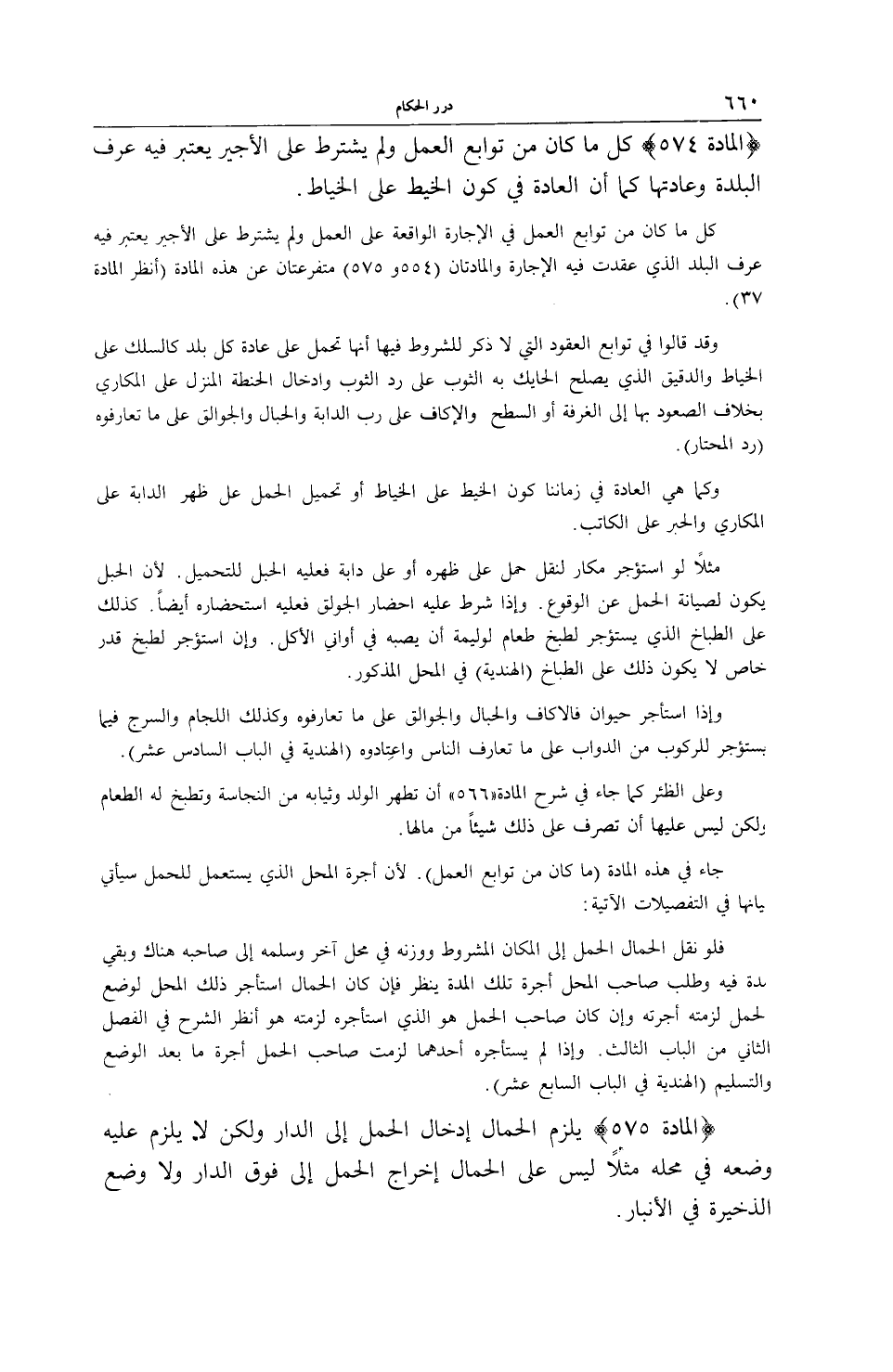 وَلَكِنْ لَيْسَ عَلَيْهَا أَنْ تَصْرِفَ عَلَى ذَلِكَ شَيْئًا مِنْ مَالِهَا جَاءَ فِي هَذِهِ الْمَادَّةِ (مَا كَانَ مِنْ تَوَابِعِ الْعَمَلِ) . لِأَنَّ أُجْرَةَ الْمَحَلِّ الَّذِي يُسْتَعْمَلُ لِلْحَمْلِ سَيَأْتِي بَيَانُهَا فِي التَّفْصِيلَاتِ الْآتِيَةِ: فَلَوْ نَقَلَ الْحَمَّالُ الْحِمْلَ إلَى الْمَكَانِ الْمَشْرُوطِ وَوَزَنَهُ فِي مَحَلٍّ آخَرَ وَسَلَّمَهُ إلَى صَاحِبِهِ هُنَاكَ وَبَقِيَ مُدَّةً فِيهِ وَطَلَبَ صَاحِبُ الْمَحَلِّ أُجْرَةَ تِلْكَ الْمُدَّةِ يُنْظَرُ فَإِنْ كَانَ الْحَمَّالُ اسْتَأْجَرَ ذَلِكَ الْمَحَلَّ لِوَضْعِ الْحِمْلِ لَزِمَتْهُ أُجْرَتُهُ وَإِنْ كَانَ صَاحِبُ الْحِمْلِ هُوَ الَّذِي اسْتَأْجَرَهُ لَزِمَتْهُ هُوَ اُنْظُرْ الشَّرْحَ فِي الْفَصْلِ الثَّانِي مِنْ الْبَابِ الثَّالِثِ. وَإِذَا لَمْ يَسْتَأْجِرْهُ أَحَدُهُمَا لَزِمَتْ صَاحِبَ الْحِمْلِ أُجْرَةُ مَا بَعْدَ الْوَضْعِ وَالتَّسْلِيمِ (الْهِنْدِيَّةُ فِي الْبَابِ السَّابِعِ عَشَرَ) (الْمَادَّةُ 575) يَلْزَمُ الْحَمَّالَ إدْخَالُ الْحِمْلِ إلَى الدَّارِ، وَلَكِنْ لَا يَلْزَمُ عَلَيْهِ وَضْعُهُ فِي مَحَلِّهِ مَثَلًا لَيْسَ عَلَى الْحَمَّالِ إخْرَاجُ الْحِمْلِ إلَى فَوْقِ الدَّارِ، وَلَا وَضْعُ الذَّخِيرَةِ فِي الْأَنْبَارِ.