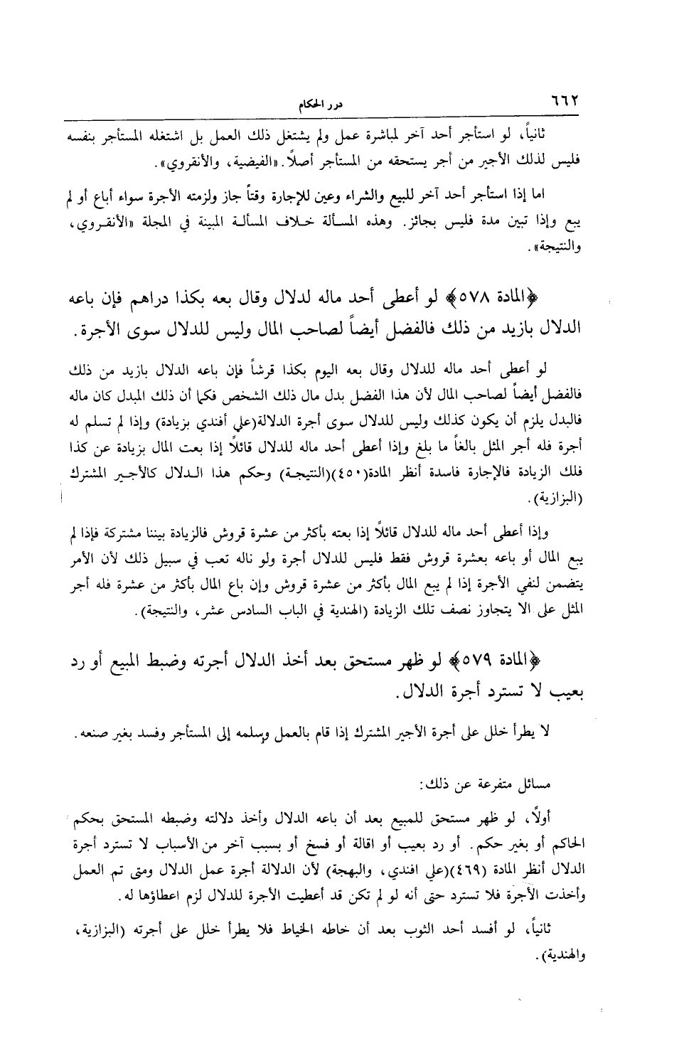 أَوَّلًا: لَوْ ظَهَرَ مُسْتَحَقٌّ لِلْمَبِيعِ بَعْدَ أَنْ بَاعَهُ الدَّلَّالُ وَأَخَذَ دَلَالَتَهُ وَضَبَطَهُ الْمُسْتَحِقُّ بِحُكْمِ الْحَاكِمِ أَوْ بِغَيْرِ حُكْمٍ. أَوْ رُدَّ بِعَيْبٍ أَوْ إقَالَةٍ أَوْ فَسْخٍ أَوْ بِسَبَبٍ آخَرَ مِنْ الْأَسْبَابِ لَا تُسْتَرَدُّ أُجْرَةُ الدَّلَّالِ اُنْظُرْ الْمَادَّةَ (469) (عَلِيٌّ أَفَنْدِي، وَالْبَهْجَةُ) لِأَنَّ الدَّلَالَةَ أُجْرَةُ عَمَلِ الدَّلَّالِ وَمَتَى تَمَّ الْعَمَلُ وَأُخِذَتْ الْأُجْرَةُ، فَلَا تُسْتَرَدُّ حَتَّى أَنَّهُ لَوْ لَمْ تَكُنْ قَدْ أُعْطِيت الْأُجْرَةُ لِلدَّلَّالِ لَزِمَ إعْطَاؤُهَا لَهُ ثَانِيًا، لَوْ أَفْسَدَ أَحَدٌ الثَّوْبَ بَعْدَ أَنْ خَاطَهُ الْخَيَّاطُ، فَلَا يَطْرَأُ خَلَلٌ عَلَى أُجْرَتِهِ (الْبَزَّازِيَّةُ، وَالْهِنْدِيَّةُ) .