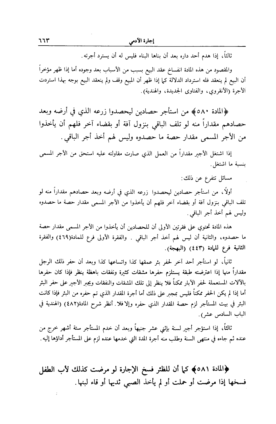 (الْمَادَّة 580) مَنْ اسْتَأْجَرَ حَصَّادِينَ لِيَحْصُدُوا زَرْعَهُ الَّذِي فِي أَرْضِهِ وَبَعْدَ حَصَادِهِمْ مِقْدَارًا مِنْهُ لَوْ تَلِفَ الْبَاقِي بِنُزُولِ آفَةٍ أَوْ بِقَضَاءٍ آخَرَ فَلَهُمْ أَنْ يَأْخُذُوا مِنْ الْأَجْرِ الْمُسَمَّى مِقْدَارَ حِصَّةِ مَا حَصَدُوهُ، وَلَيْسَ لَهُمْ أَخْذُ أَجْرِ الْبَاقِي. إذَا اشْتَغَلَ الْأَجِيرُ مِقْدَارًا مِنْ الْعَمَلِ الَّذِي صَارَتْ مُقَاوَلَتُهُ عَلَيْهِ اسْتَحَقَّ مِنْ الْأَجْرِ الْمُسَمَّى بِنِسْبَةِ مَا اُشْتُغِلَ.