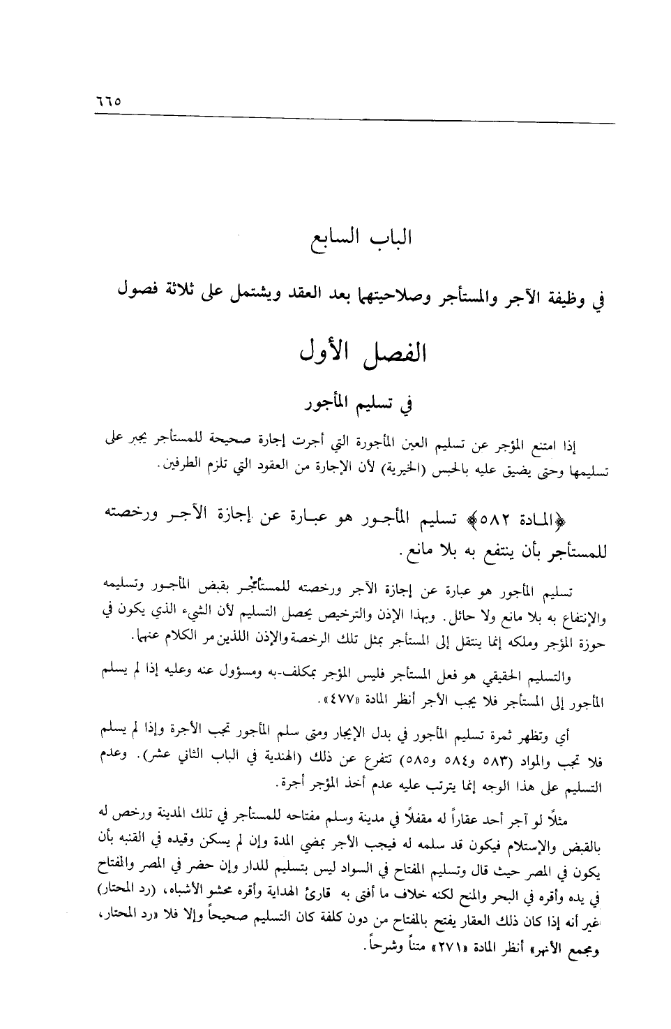 (الْمَادَّةُ 582) تَسْلِيمُ الْمَأْجُورِ هُوَ عِبَارَةٌ عَنْ إجَازَةِ الْآجِرِ وَرُخْصَتُهُ لِلْمُسْتَأْجِرِ بِأَنْ يَنْتَفِعَ بِهِ بِلَا مَانِعٍ تَسْلِيمُ الْمَأْجُورِ هُوَ عِبَارَةٌ عَنْ إجَارَةِ الْآجِرِ وَرُخْصَتُهُ لِلْمُسْتَأْجِرِ بِقَبْضِ الْمَأْجُورِ وَتَسْلِيمِهِ وَالِانْتِفَاعِ بِهِ بِلَا مَانِعٍ، وَلَا حَائِلٍ وَبِهَذَا الْإِذْنِ وَالتَّرْخِيصِ يَحْصُلُ التَّسْلِيمُ؛ لِأَنَّ الشَّيْءَ الَّذِي يَكُونُ فِي حَوْزَةِ الْمُؤَجِّرِ وَمُلْكِهِ إنَّمَا يَنْتَقِلُ إلَى الْمُسْتَأْجِرِ بِمِثْلِ تِلْكَ الرُّخْصَةِ وَالْإِذْنِ اللَّذَيْنِ مَرَّ الْكَلَامُ عَنْهُمَا، وَالتَّسْلِيمُ الْحَقِيقِيُّ هُوَ فِعْلُ الْمُسْتَأْجِرِ، فَلَيْسَ الْمُؤَجِّرُ بِمُكَلَّفٍ بِهِ وَمَسْئُولٍ عَنْهُ وَعَلَيْهِ إذَا لَمْ يُسَلِّمْ الْمَأْجُورَ إلَى الْمُسْتَأْجِرِ، فَلَا يَجِبُ الْأَجْرُ اُنْظُرْ الْمَادَّةَ " 477 " أَيْ وَتَظْهَرُ ثَمَرَةُ تَسْلِيمِ الْمَأْجُورِ فِي بَدَلِ الْإِيجَارِ وَمَتَى سَلَّمَ الْمَأْجُورَ تَجِبْ الْأُجْرَةُ، وَإِذَا لَمْ يُسَلِّمْ، فَلَا تَجِبُ وَالْمَوَادُّ (583 و 584 و 585) تَتَفَرَّعُ عَنْ ذَلِكَ (الْهِنْدِيَّةُ فِي الْبَابِ الثَّانِيَ عَشَرَ) وَعَدَمُ التَّسْلِيمِ عَلَى هَذَا الْوَجْهِ إنَّمَا يَتَرَتَّبُ عَلَيْهِ عَدَمُ أَخْذِ الْمُؤَجِّرِ أُجْرَةً، مَثَلًا لَوْ آجَرَ أَحَدٌ عَقَارًا لَهُ مُقْفَلًا فِي مَدِينَةٍ وَسَلَّمَ مِفْتَاحَهُ لِلْمُسْتَأْجِرِ فِي تِلْكَ الْمَدِينَةِ وَرَخَّصَ لَهُ بِالْقَبْضِ وَالِاسْتِلَامِ فَيَكُونُ قَدْ سَلَّمَهُ لَهُ فَيَجِبُ الْأَجْرُ بِمُضِيِّ الْمُدَّةِ، وَإِنْ لَمْ يَسْكُنْ وَقَيَّدَهُ فِي الْقُنْيَةِ بِأَنْ يَكُونَ فِي الْمِصْرِ حَيْثُ قَالَ: وَتَسْلِيمُ الْمِفْتَاحِ فِي السَّوَادِ لَيْسَ بِتَسْلِيمٍ لِلدَّارِ وَإِنْ حَضَرَ فِي الْمِصْرِ وَالْمِفْتَاحُ فِي يَدِهِ وَأَقَرَّهُ فِي الْبَحْرِ وَالْمِنَحِ لَكِنَّهُ خِلَافُ مَا أَفْتَى بِهِ قَارِئُ الْهِدَايَةِ وَأَقَرَّهُ مَحْشُوُّ الْأَشْبَاهِ (رَدُّ الْمُحْتَارِ) غَيْرَ أَنَّهُ إذَا كَانَ ذَلِكَ الْعَقَارُ يُفْتَحُ بِالْمِفْتَاحِ مِنْ دُونِ كُلْفَةٍ كَانَ التَّسْلِيمُ صَحِيحًا، وَإِلَّا فَلَا " رَدُّ الْمُحْتَارِ " وَمَجْمَعُ الْأَنْهُرِ " اُنْظُرْ الْمَادَّةَ " 271 " مَتْنًا وَشَرْحًا