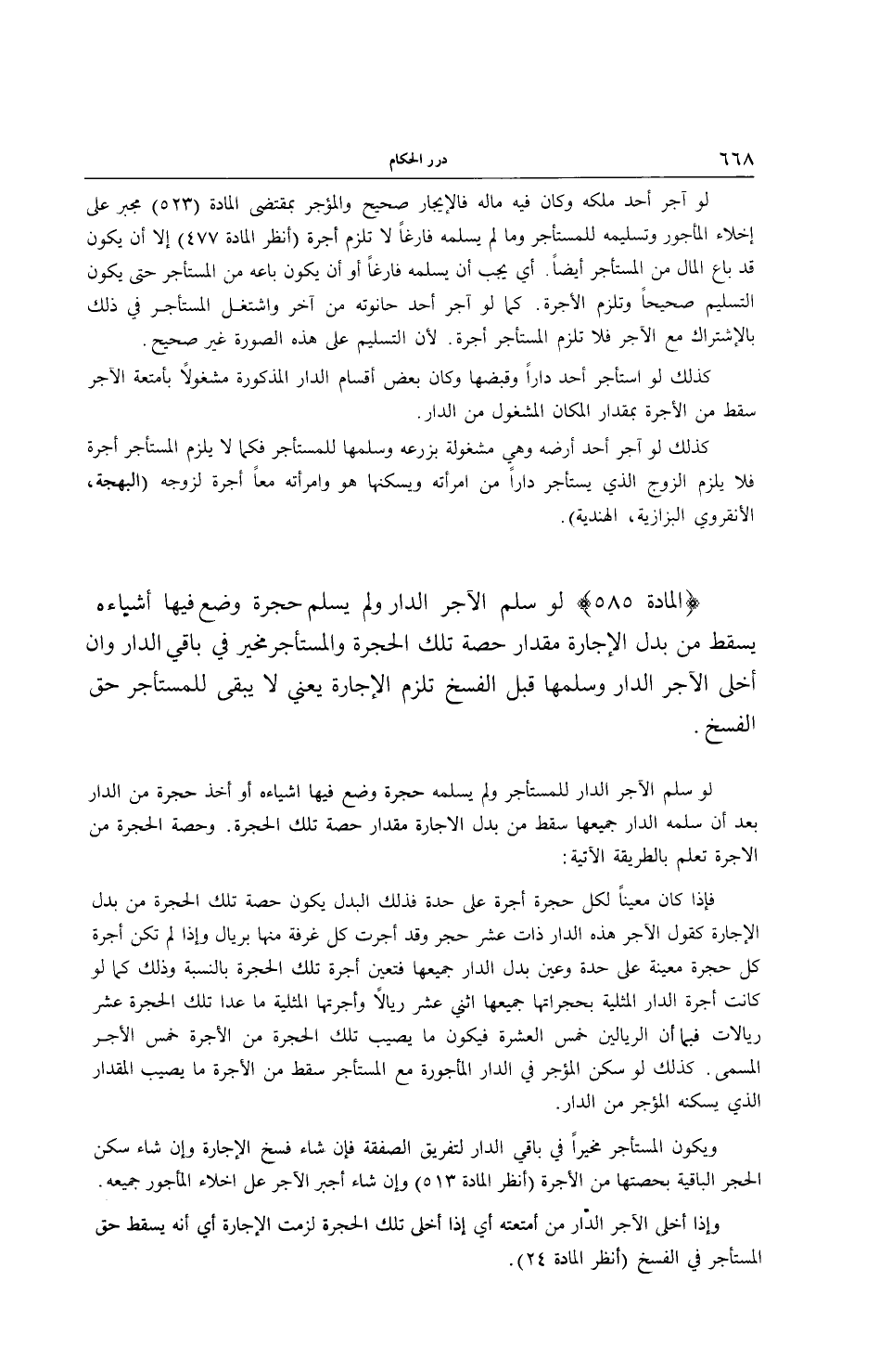 (الْمَادَّةُ 585) لَوْ سَلَّمَ الْآجِرُ الدَّارَ، وَلَمْ يُسَلِّمْ حُجْرَةً وَضَعَ فِيهَا أَشْيَاءَهُ، يَسْقُطُ مِنْ بَدَلِ الْإِجَارَةِ مِقْدَارُ حِصَّةِ تِلْكَ الْحُجْرَةِ، وَالْمُسْتَأْجِرُ مُخَيَّرٌ فِي بَاقِي الدَّارِ وَإِنْ أَخْلَى الْآجِرُ الدَّارَ وَسَلَّمَهَا قَبْلَ الْفَسْخِ تَلْزَمُ الْإِجَارَةُ يَعْنِي لَا يَبْقَى لِلْمُسْتَأْجِرِ حَقُّ الْفَسْخِ. لَوْ سَلَّمَ الْآجِرُ الدَّارَ لِلْمُسْتَأْجِرِ، وَلَمْ يُسَلِّمْهُ حُجْرَةً وَضَعَ فِيهَا أَشْيَاءَهُ أَوْ أَخَذَ حُجْرَةً مِنْ الدَّارِ بَعْدَ أَنْ سَلَّمَهُ الدَّارَ جَمِيعَهَا سَقَطَ مِنْ بَدَلِ الْإِجَارَةِ مِقْدَارُ حِصَّةِ تِلْكَ الْحُجْرَةِ.
