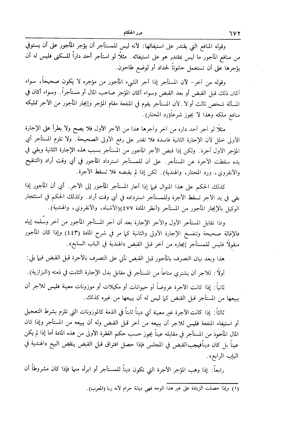 وَقَوْلُهُ الْمَنَافِعُ الَّتِي يُقْتَدَرُ عَلَى اسْتِيفَائِهَا: لِأَنَّهُ لَيْسَ لِلْمُسْتَأْجِرِ أَنْ يُؤَجِّرَ الْمَأْجُورَ عَلَى أَنْ يَسْتَوْفِيَ مِنْ مَنَافِعِ الْمَأْجُورِ مَا لَيْسَ بِمُقْتَدِرٍ هُوَ عَلَى اسْتِيفَائِهِ. مَثَلًا لَوْ اسْتَأْجَرَ أَحَدٌ دَارًا لِلسُّكْنَى، فَلَيْسَ لَهُ أَنْ يُؤَجِّرَهَا عَلَى أَنْ تُسْتَعْمَلَ حَانُوتًا لِحَدَّادٍ أَوْ لِوَضْعِ طَاحُونٍ، وَقَوْلُهُ مِنْ آخَرَ - لِأَنَّ الْمُسْتَأْجِرَ إذَا آجَرَ الشَّيْءَ الْمَأْجُورَ مِنْ مُؤَجِّرِهِ لَا يَكُونُ صَحِيحًا، سَوَاءٌ أَكَانَ ذَلِكَ قَبْلَ الْقَبْضِ أَوْ بَعْدَ الْقَبْضِ وَسَوَاءٌ أَكَانَ الْمُؤَجَّرُ صَاحِبَ الْمَالِ أَوْ مُسْتَأْجِرًا. وَسَوَاءٌ أَكَانَ فِي الْمَسْأَلَةِ شَخْصٌ ثَالِثٌ أَوْ لَا؛ لِأَنَّ الْمُسْتَأْجِرَ يَقُومُ فِي الْمَنْفَعَةِ مَقَامَ الْمُؤَجَّرِ وَإِيجَارُ الْمَأْجُورِ مِنْ الْآجِرِ تَمْلِيكُهُ مَنَافِعَ مِلْكِهِ، وَهَذَا لَا يَجُوزُ شَرْعًا (رَدُّ الْمُحْتَارِ) . مَثَلًا لَوْ آجَرَ أَحَدٌ دَارِهِ مِنْ آخَرَ وَآجَرَهَا هَذَا مِنْ الْآجِرِ الْأَوَّلِ فَلَا يَصِحُّ، وَلَا يَطْرَأُ عَلَى الْإِجَارَةِ الْأُولَى خَلَلٌ؛ لِأَنَّ الْإِجَارَةَ الثَّانِيَةَ فَاسِدَةٌ، فَلَا تَقْدِرُ عَلَى رَفْعِ الْأُولَى الصَّحِيحَةِ، وَلَا تَلْزَمُ الْمُسْتَأْجِرَ أَيْ الْمُؤَجِّرَ الْأَوَّلَ أُجْرَةٌ. وَلَكِنْ إذَا قَبَضَ الْآجِرُ الْمَأْجُورَ مِنْ الْمُسْتَأْجِرِ بِسَبَبِ هَذِهِ الْإِجَارَةِ الثَّانِيَةِ وَبَقِيَ فِي يَدِهِ سَقَطَتْ الْأُجْرَةُ عَنْ الْمُسْتَأْجِرِ. عَلَى أَنَّ لِلْمُسْتَأْجِرِ اسْتِرْدَادَ الْمَأْجُورِ فِي أَيِّ وَقْتٍ أَرَادَ (التَّنْقِيحُ وَالْأَنْقِرْوِيّ، وَرَدُّ الْمُحْتَارِ، وَالْهِنْدِيَّةُ) . لَكِنْ إذَا لَمْ يَقْبِضْهُ، فَلَا تَسْقُطُ الْأُجْرَةُ كَذَلِكَ الْحُكْمُ عَلَى هَذَا الْمِنْوَالِ فِيمَا إذَا أَعَارَ الْمُسْتَأْجِرُ الْمَأْجُورَ إلَى الْآجِرِ. أَيْ إنَّ الْمَأْجُورَ إذَا بَقِيَ فِي يَدِ الْآجِرِ تَسْقُطُ الْأُجْرَةُ وَلِلْمُسْتَأْجِرِ اسْتِرْدَادُهُ فِي أَيِّ وَقْتٍ أَرَادَ. وَكَذَلِكَ الْحُكْمُ فِي اسْتِئْجَارِ الْوَكِيلِ بِالْإِيجَارِ الْمَأْجُورِ مِنْ الْمُسْتَأْجِرِ (اُنْظُرْ الْمَادَّةَ 477) (الْأَشْبَاهُ، وَالْأَنْقِرْوِيّ، وَالْهِنْدِيَّةُ) . وَاذَا تَقَايَلَ الْمُسْتَأْجِرُ الْأَوَّلُ وَالْآجِرُ الْإِجَارَةَ بَعْدَ أَنْ آجَرَ الْمُسْتَأْجِرُ الْمَأْجُورَ مِنْ آخَرَ وَسَلَّمَهُ إيَّاهُ فَالْإِقَالَةُ صَحِيحَةٌ وَتَنْفَسِخُ الْإِجَارَةُ الْأُولَى وَالثَّانِيَةُ، كَمَا مَرَّ فِي شَرْحِ الْمَادَّةِ (443) ، وَإِذَا كَانَ الْمَأْجُورُ مَنْقُولًا، فَلَيْسَ لِلْمُسْتَأْجِرِ إيجَارُهُ مِنْ آخَرَ قَبْلَ الْقَبْضِ " الْهِنْدِيَّةُ فِي الْبَابِ السَّابِعِ ". هَذَا وَبَعْدَ بَيَانِ التَّصَرُّفِ بِالْمَأْجُورِ قَبْلَ الْقَبْضِ نَأْتِي عَلَى التَّصَرُّفِ بِالْأُجْرَةِ قَبْلَ الْقَبْضِ فِيمَا يَلِي: