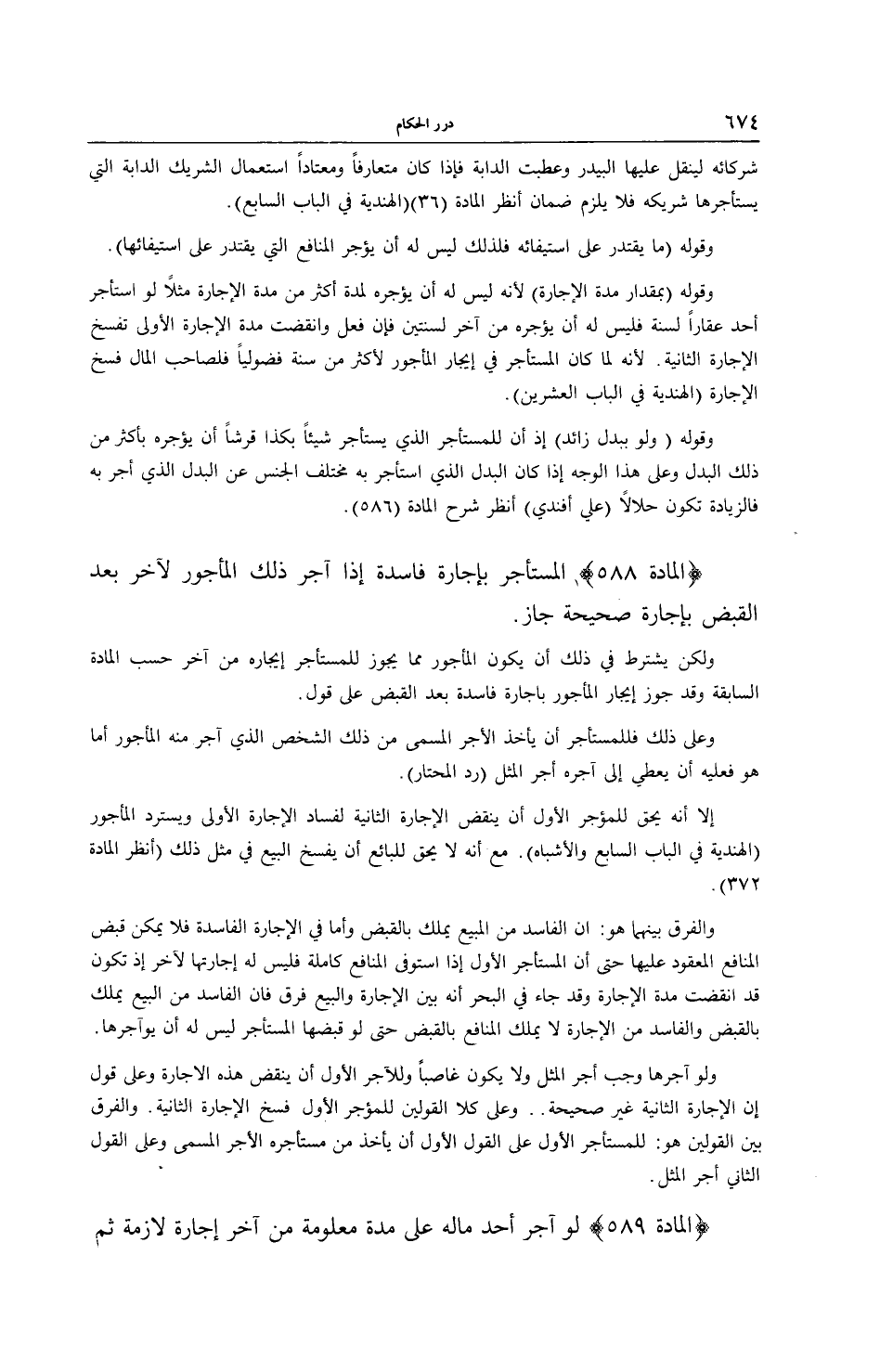 شُرَكَائِهِ لِيَنْقُلَ عَلَيْهَا الْبَيْدَرَ وَعَطِبَتْ الدَّابَّةُ، فَإِذَا كَانَ مُتَعَارَفًا وَمُعْتَادًا اسْتِعْمَالُ الشَّرِيكِ الدَّابَّةَ الَّتِي يَسْتَأْجِرُهَا شَرِيكُهُ، فَلَا يَلْزَمُ ضَمَانٌ اُنْظُرْ الْمَادَّةَ (36) (الْهِنْدِيَّةُ فِي الْبَابِ السَّابِعِ) . وَقَوْلُهُ (مَا يُقْتَدَرُ عَلَى اسْتِيفَائِهِ فَلِذَلِكَ لَيْسَ لَهُ أَنْ يُؤَجِّرَ الْمَنَافِعَ الَّتِي يَقْتَدِرُ عَلَى اسْتِيفَائِهَا) وَقَوْلُ (بِمِقْدَارِ مُدَّةِ الْإِجَارَةِ) ؛ لِأَنَّهُ لَيْسَ لَهُ أَنْ يُؤَجِّرَهُ لِمُدَّةٍ أَكْثَرَ مِنْ مُدَّةِ الْإِجَارَةِ. مَثَلًا لَوْ اسْتَأْجَرَ أَحَدٌ عَقَارًا لِسَنَةٍ، فَلَيْسَ لَهُ أَنْ يُؤَجِّرَهُ مِنْ آخَرَ لِسَنَتَيْنِ فَإِنْ فَعَلَ وَانْقَضَتْ مُدَّةُ الْإِجَارَةِ الْأُولَى تُفْسَخْ الْإِجَارَةُ الثَّانِيَةُ؛ لِأَنَّهُ لَمَّا كَانَ الْمُسْتَأْجِرُ فِي إيجَارِ الْمَأْجُورِ لِأَكْثَرَ مِنْ سَنَةٍ فُضُولِيًّا فَلِصَاحِبِ الْمَالِ فَسْخُ الْإِجَارَةِ (الْهِنْدِيَّةُ فِي الْبَابِ الْعِشْرِينَ) . وَقَوْلُهُ (وَلَوْ بِبَدَلٍ زَائِدٍ) إذْ أَنَّ لِلْمُسْتَأْجِرِ الَّذِي يَسْتَأْجِرُ شَيْئًا بِكَذَا قِرَشًا أَنْ يُؤَجِّرَهُ بِأَكْثَرَ مِنْ ذَلِكَ الْبَدَلِ، وَعَلَى هَذَا الْوَجْهِ إذَا كَانَ الْبَدَلُ الَّذِي اسْتَأْجَرَ بِهِ مُخْتَلِفَ الْجِنْسِ عَنْ الْبَدَلِ الَّذِي أَجَّرَ بِهِ فَالزِّيَادَةُ تَكُونُ حَلَالًا (عَلِيٌّ أَفَنْدِي) اُنْظُرْ شَرْحَ الْمَادَّةِ (586) .