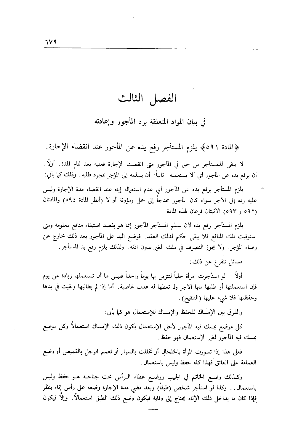 الْمَادَّةُ 591) يَلْزَمُ الْمُسْتَأْجِرَ رَفْعُ يَدِهِ عَنْ الْمَأْجُورِ عِنْدَ انْقِضَاءِ الْإِجَارَةِ. لَا يَبْقَى لِلْمُسْتَأْجِرِ مِنْ حَقٍّ فِي الْمَأْجُورِ مَتَى انْقَضَتْ الْإِجَارَةُ فَعَلَيْهِ بَعْدَ تَمَامِ الْمُدَّةِ:
